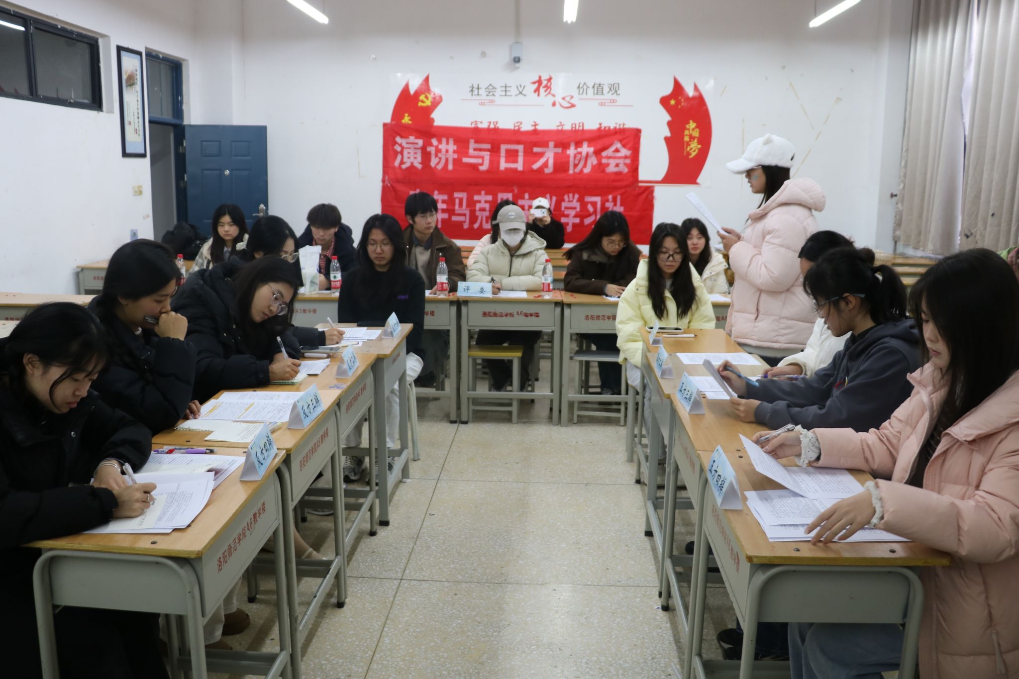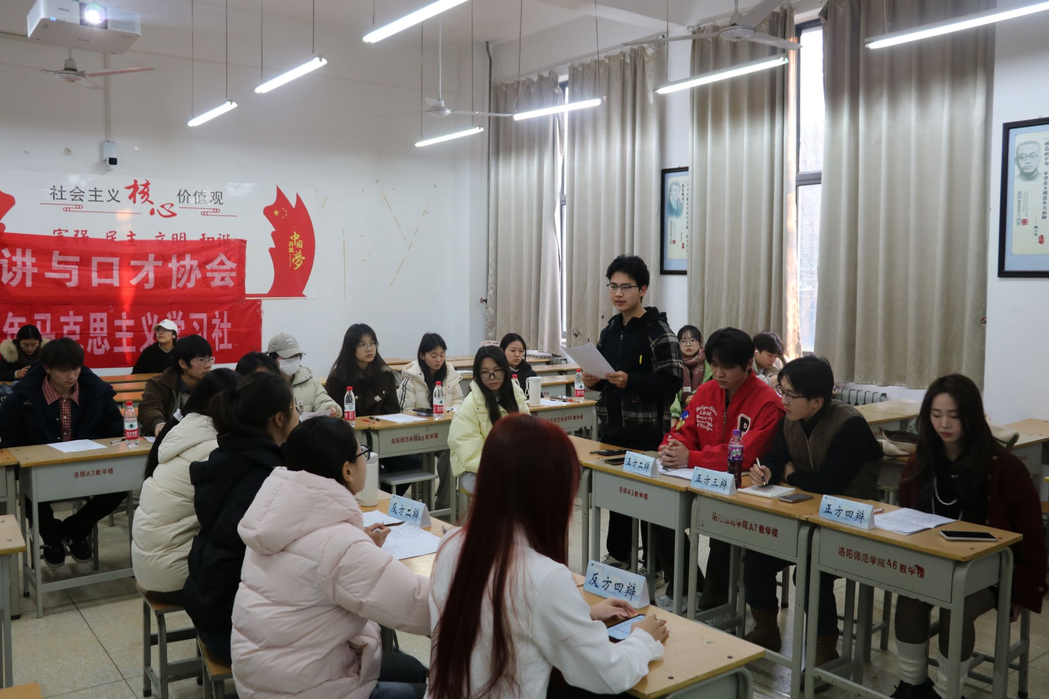 12月18日下午,由马克思主义学院联合问礼书院二号学生社区共同举办的“辩响校园,智汇青春”辩论赛复赛在A6-102教室正式拉开帷幕。12支优秀辩论队伍同台竞技,吸引了众多师生到场观赛。