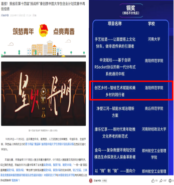 本届比赛,我院的“创艺乡村”项目是学校唯一推荐参加国赛的项目,该项目由我院宋蒙蒙、王新宇、李艳芳三位老师指导,项目成员由我院学生蒋智慧、于莹莹、君梦瑶、张倩玲、张梦姿、王青清、张宽,新闻与传播学院学生石鑫,商学院学生刘高亚,文学院学生徐沁怡等10名学生构成。项目先后通过了院赛、校赛、省赛评审,今年6月份在河南理工大学进行了激烈的省赛角逐,并荣获省赛金奖,最终推荐至国赛。