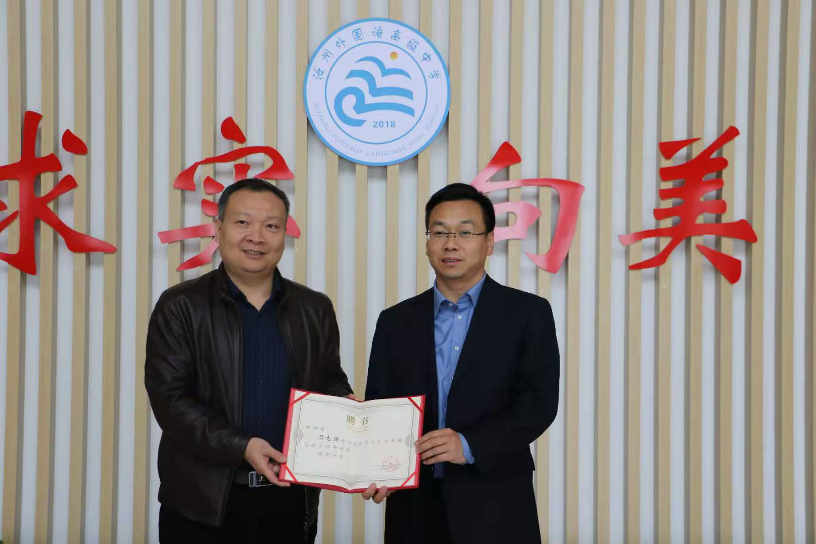 董书记对学校的热情接待及高度评价表示感谢,介绍了学院近年来在人才培养特别是师范技能培养方面所做的努力及取得的成绩。希望未来能够进一步加深与汝州外国语高级中学在教学改革、学生实习、就业等方面的合作,积极对接学校需求,不断创新人才培养模式,提高人才培养质量,服务我省基础教育。董书记诚挚的邀请有名校教育管理经验的吕校长担任洛阳师范学院数学科学学院的“大学生职业发展与就业指导”导师。并颁发了聘书。