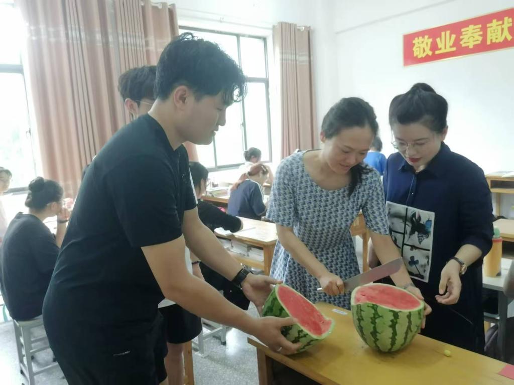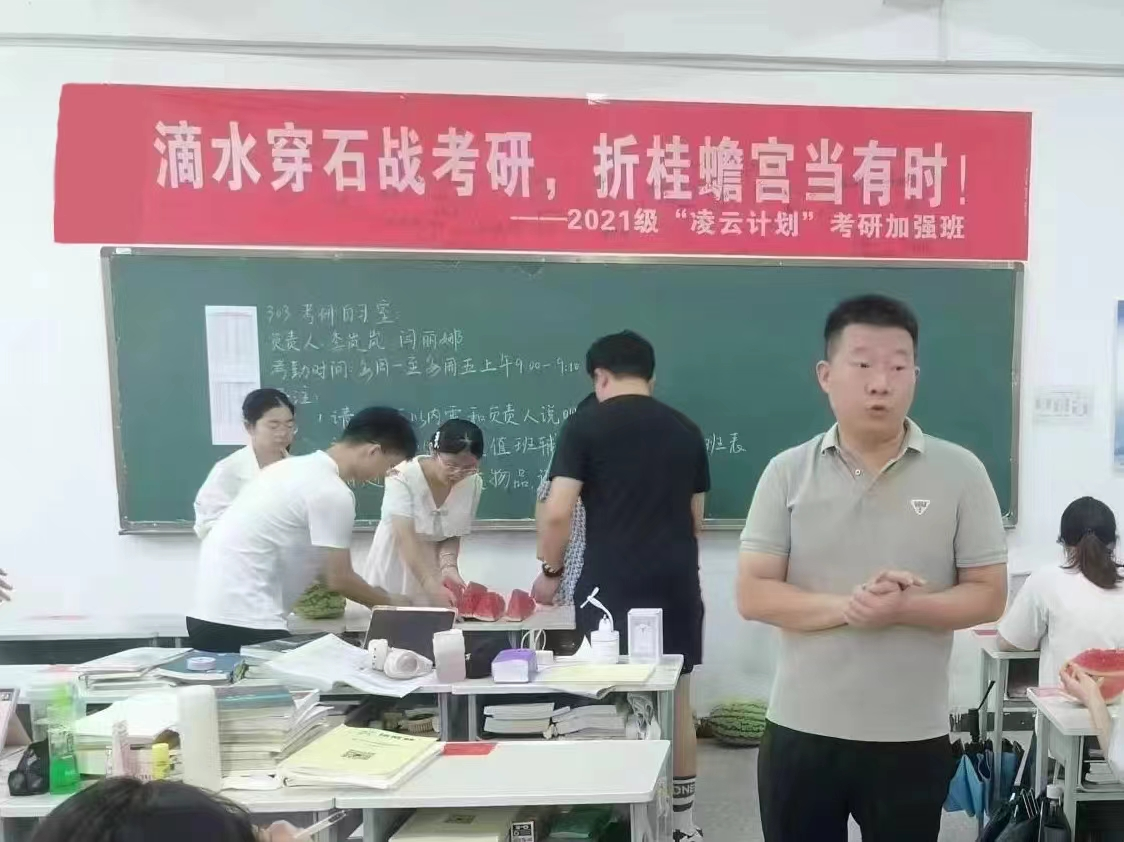 刘迎照肯定了同学们积极备考的学习状态,并亲切询问了学生的生活和学习情况,希望大家充分利用好暑期的黄金时间,全身心投入到考研复习中。同时,他就同学们的学习与考研规划给出了合理建议。他强调同学们要注意安全,遵守学校规章制度,有困难及时与老师反馈,提醒同学们做好学习规划,劳逸结合,合理安排作息时间,科学复习。由于天气炎热,领导老师们提醒同学们注意防暑并为同学们送去西瓜,希望同学们在考研这场持久战中,都能保持健康的身体和良好的状态。