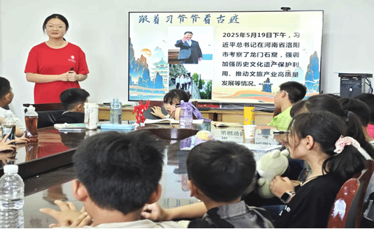 瑰宝传文脉,双语展风采。在袁付社区举办的“小外游神都”双语实践活动中,实践队员将外语学习与文旅融合体验相结合,引导青少年在云游名胜古迹的同时,用双语童声讲述千年古都的文明魅力。在洛阳博物馆,陈梓骞、郭若涵小朋友化身“小小讲解员”,用中英双语生动解说“曹魏白玉杯”“唐三彩”等珍贵文物,彰显着新时代青少年的文化自信。通过“文物小卫士”角色扮演,孩子们在模拟劝阻不文明行为中深化文物保护意识,实现语言能力与文化认同的双向提升。