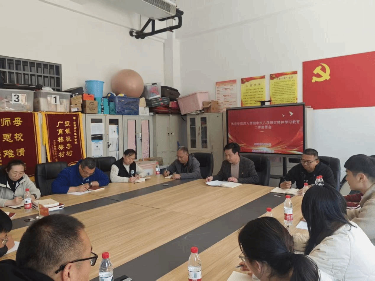 2025年3月20日,体育学院在B112会议室召开深入贯彻中央八项规定精神学习教育工作部署会,体育学院领导班子、各教研室主任以及全体辅导员参加会议。会议由学院党委副书记翟强主持。