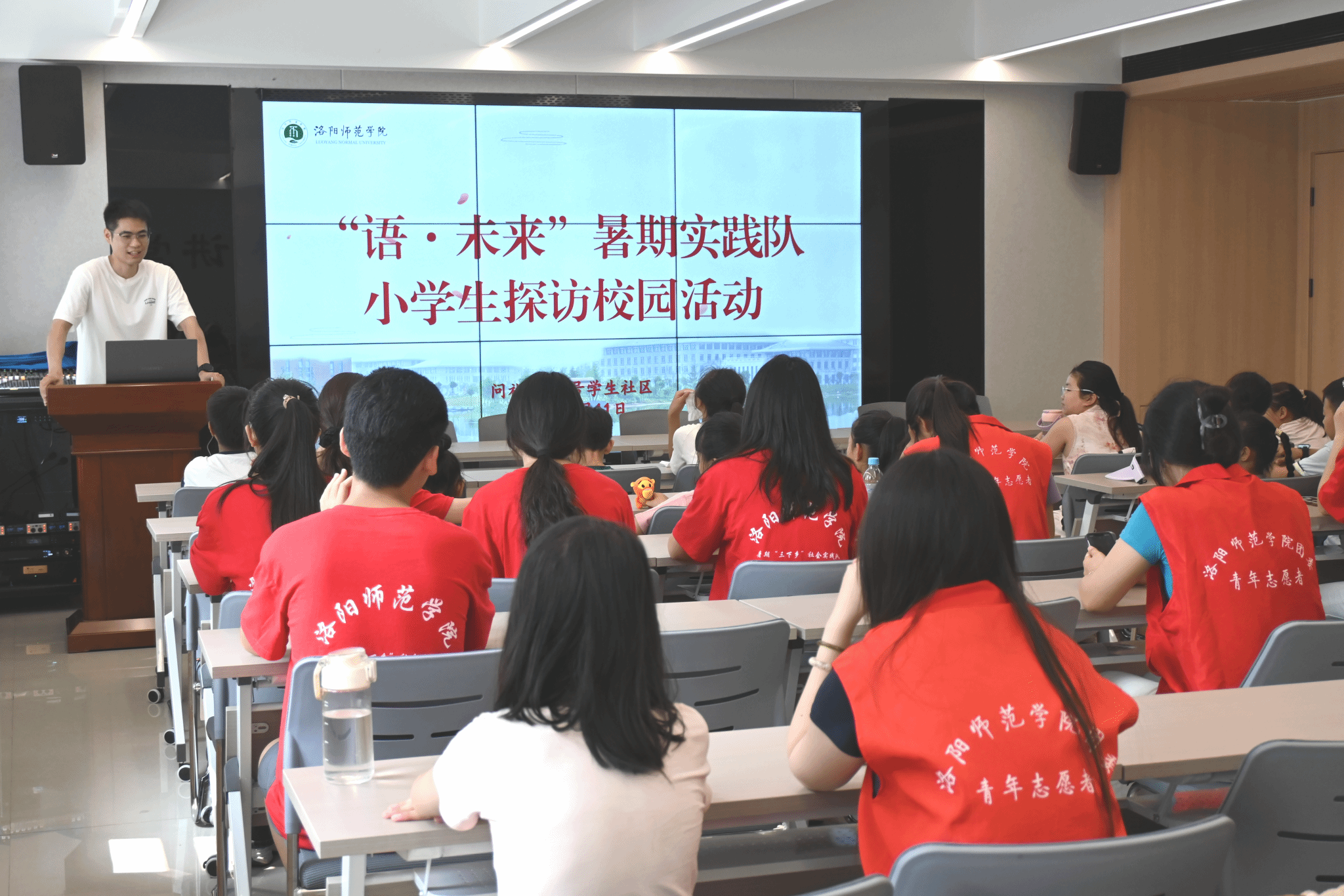 7 月 11 日,“语・未来”暑期实践队带领洛阳市伊滨区光武街道20余名青少年走进洛阳师范学院,开展“童心探学府·书香启未来”研学活动,以沉浸式体验拓宽青少年视野,播撒求知的种子。