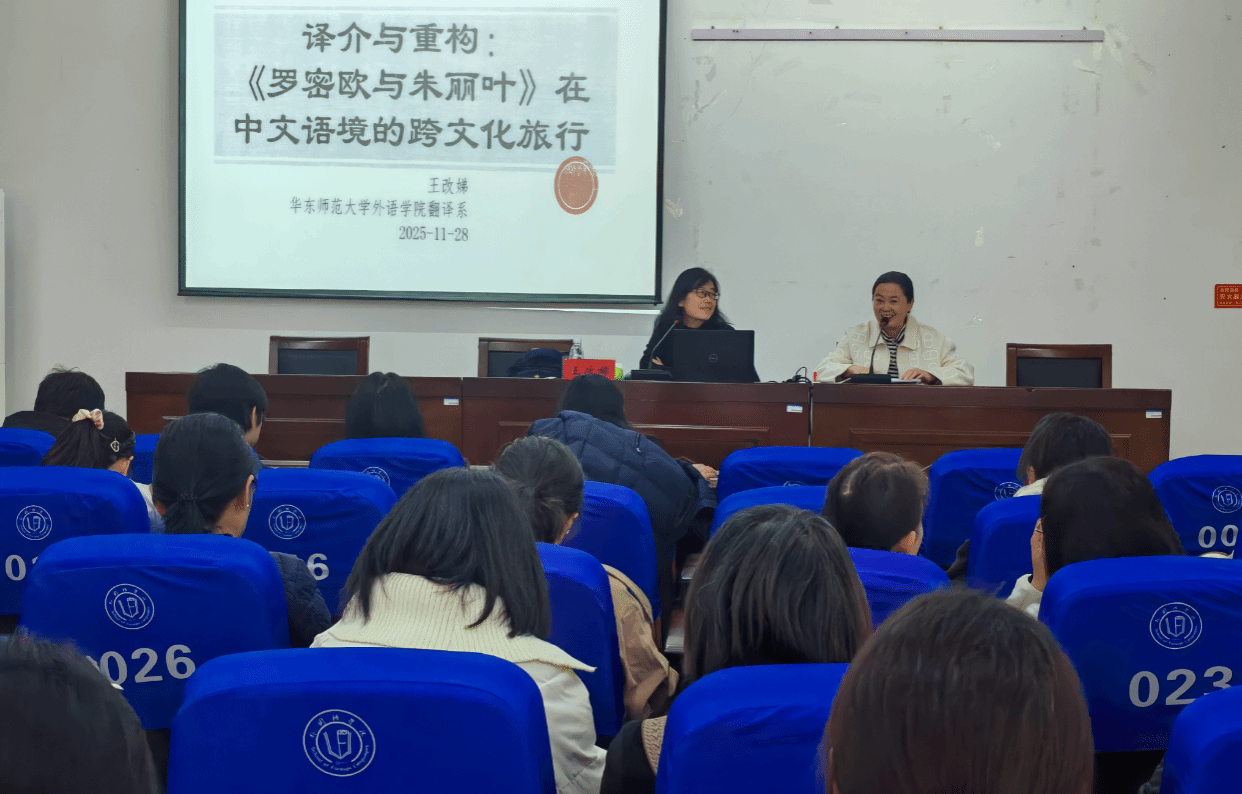 2025年11月28日上午,华东师范大学王改娣教授应邀莅临我院,在302会议室为我院师生带来了一场题为“译介与重构:《罗密欧与朱丽叶》在中文语境的跨文化旅行”的学术讲座。本次讲座由外国语学院副院长贺剑瑜主持,我院百余名师生到场聆听。