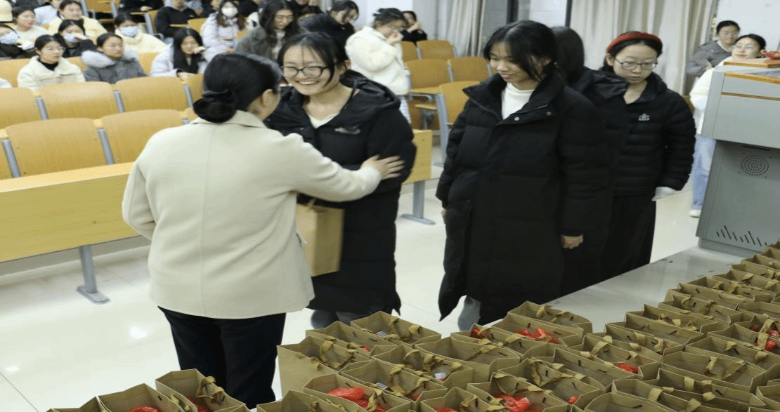 除了言语上的勉励,与会领导还向同学们发放了“考研加油包”,礼包中既有寓意“心想事成”的鲜果,也有助力健康的牛奶,还有缓解压力的惊喜盲盒,真正将对考研学子的关怀从“口头”落到了“实处”。