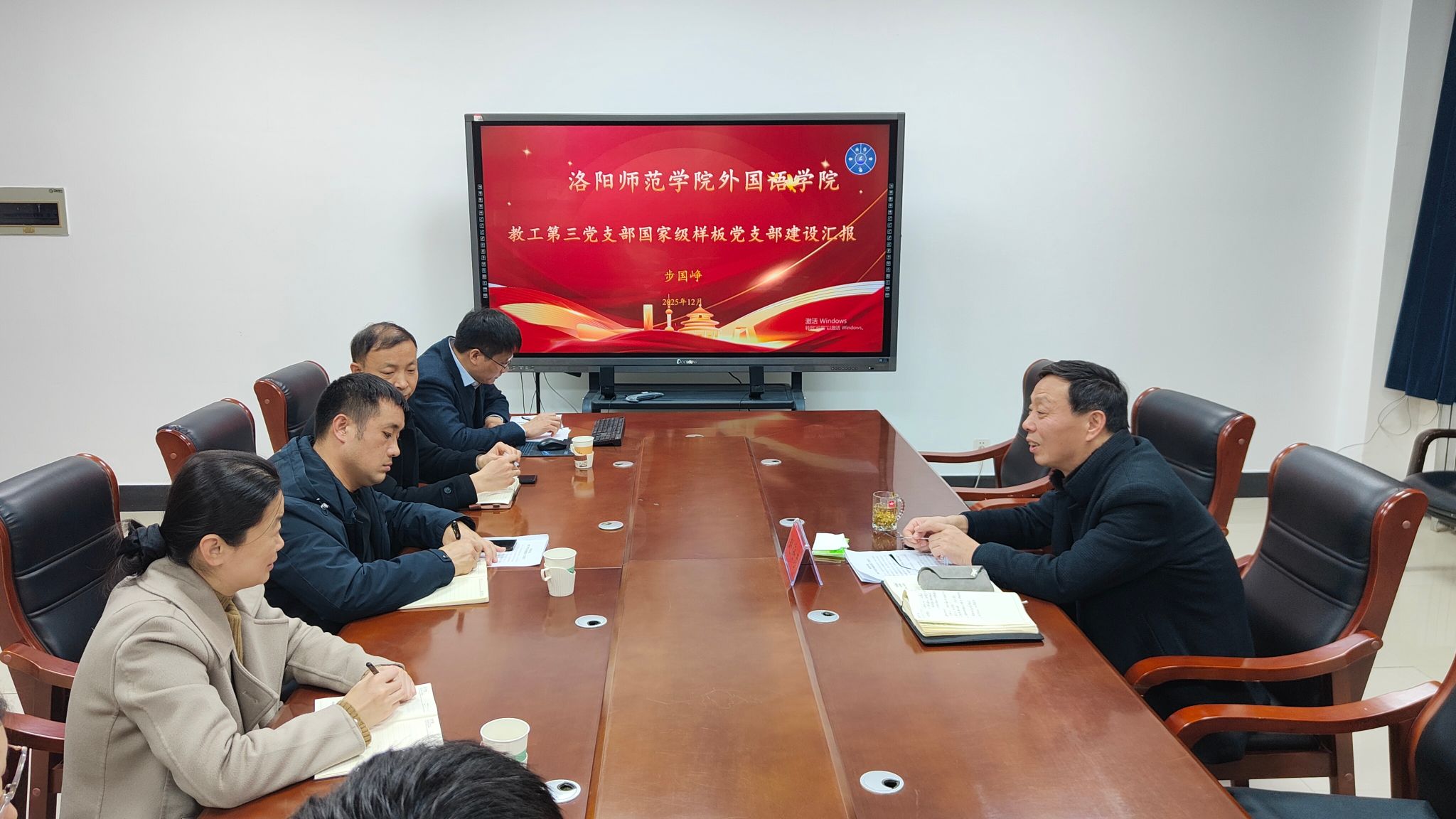 在听取支部汇报,并与支部党员、入党积极分子充分交流后,赵海彦对支部所取得的成绩给予了充分肯定,并就如何进一步发挥国家样板支部的示范引领作用,推动学校党建事业高质量发展提出了宝贵意见和建议。他指出,国家样板支部建设是提升基层党组织组织力、强化政治功能的重要抓手。他强调,一要持续深化理论武装,将学习贯彻党的最新理论成果与教学科研工作紧密结合,全面贯穿于人才培养、科学研究、社会服务等全过程。二要创新工作方法,结合学科专业特点,擦亮“双语党建+”特色品牌,在制度创新、载体设计、科技赋能、品牌塑造上形成更多可复制、可推广的经验模式。三要强化辐射带动,通过结对共建、经验分享等方式,帮助其他支部共同提升,推动全校党建工作整体跃升。他鼓励支部全体党员继续保持昂扬向上的精神状态,为学校事业发展提供坚强的政治保证。