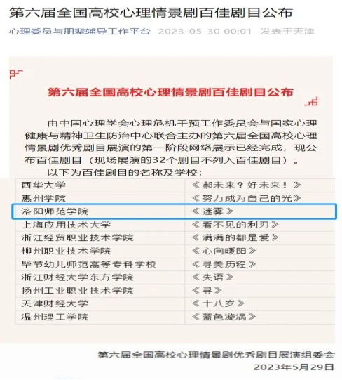 近日,由我院学生原创的心理情景剧《迷雾》在第六届全国高校心理情景剧优秀剧目展“心沐阳光,青春绽放”比赛中斩获佳绩,荣获大赛百佳剧目奖。