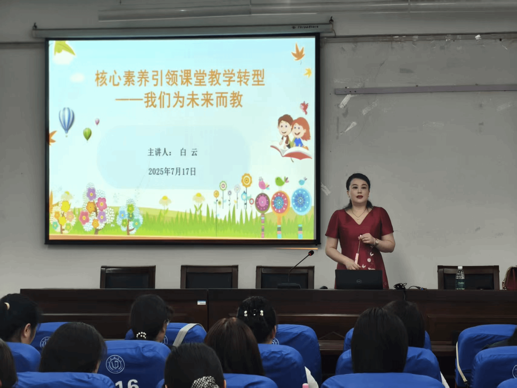 2025年7月17日上午,湖北省武昌水果湖第一小学正高级教师、湖北省特级教师白云老师,以《核心素养引领课堂教学转型——我们为未来而教》为主题,讲述了自身专业成长的历程。白老师指出,在教学中,老师们可以通过生动的课例与创新实践,例如优化课堂指令、创编教学歌曲、巧制教具、设计趣味作业等让英语课堂焕发活力与魅力,点燃学生学习的热情;在教育的探索之路上,让学习清晰可见,促思维深度发生,使文化无声浸润,助生命灵动舒展,令素养自然彰显;唯有胸有丘壑,方能讲台从容。她鼓励教师们淬炼教学智慧,打造独具魅力的课堂,在师生共进的旅程中,实现从胜任到卓越的跨越。