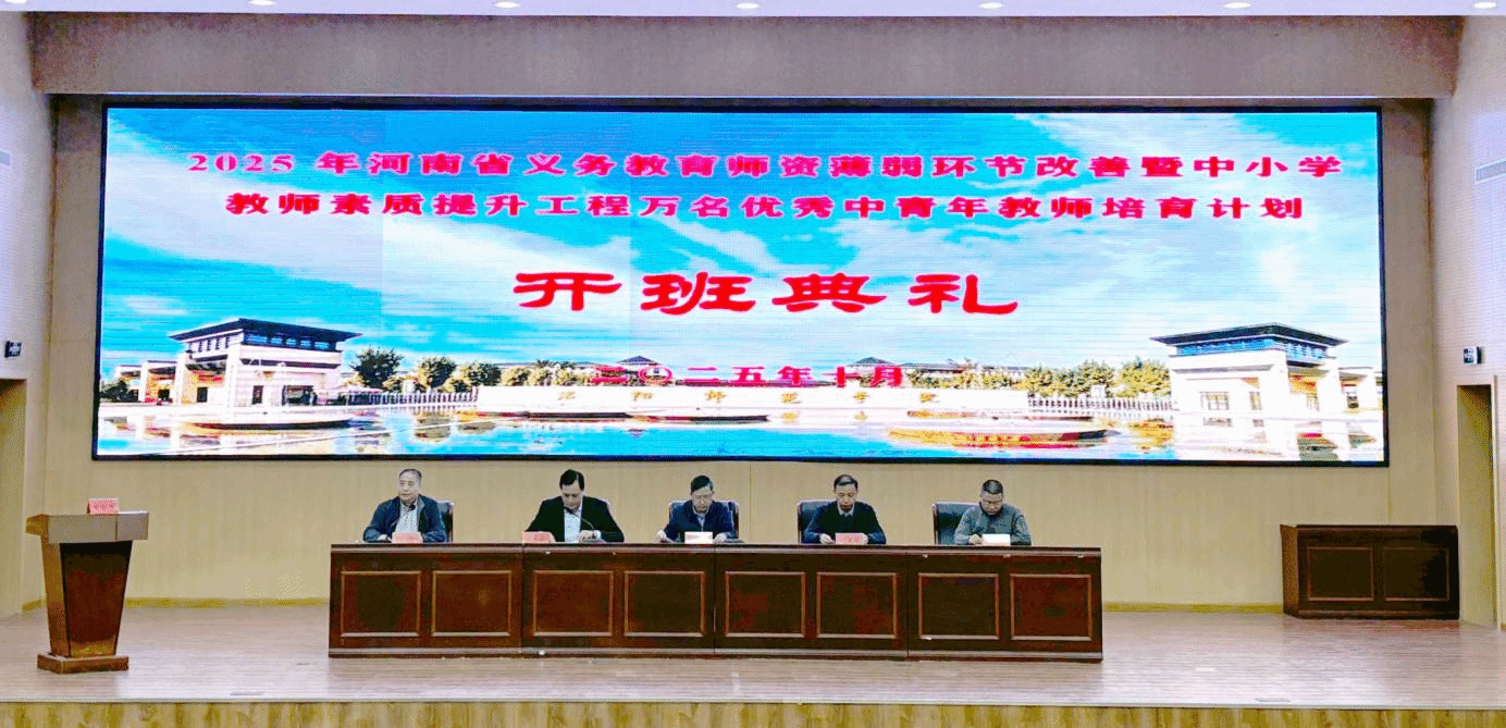 2025年10月10日上午,由我校承办的2025年“义务教育师资薄弱环节改善暨中小学教师素质提升工程”万名优秀中青年教师培育计划开班典礼在逸夫楼G1-112会议室举行。洛阳师范学院党委副书记曹玉涛出席,洛阳师范学院河南省中小学教师校长研修院执行院长冯虎成、外国语学院副院长刘启成、数学科学学院副院长王丰辉以及200余名参训教师参加了开班典礼。