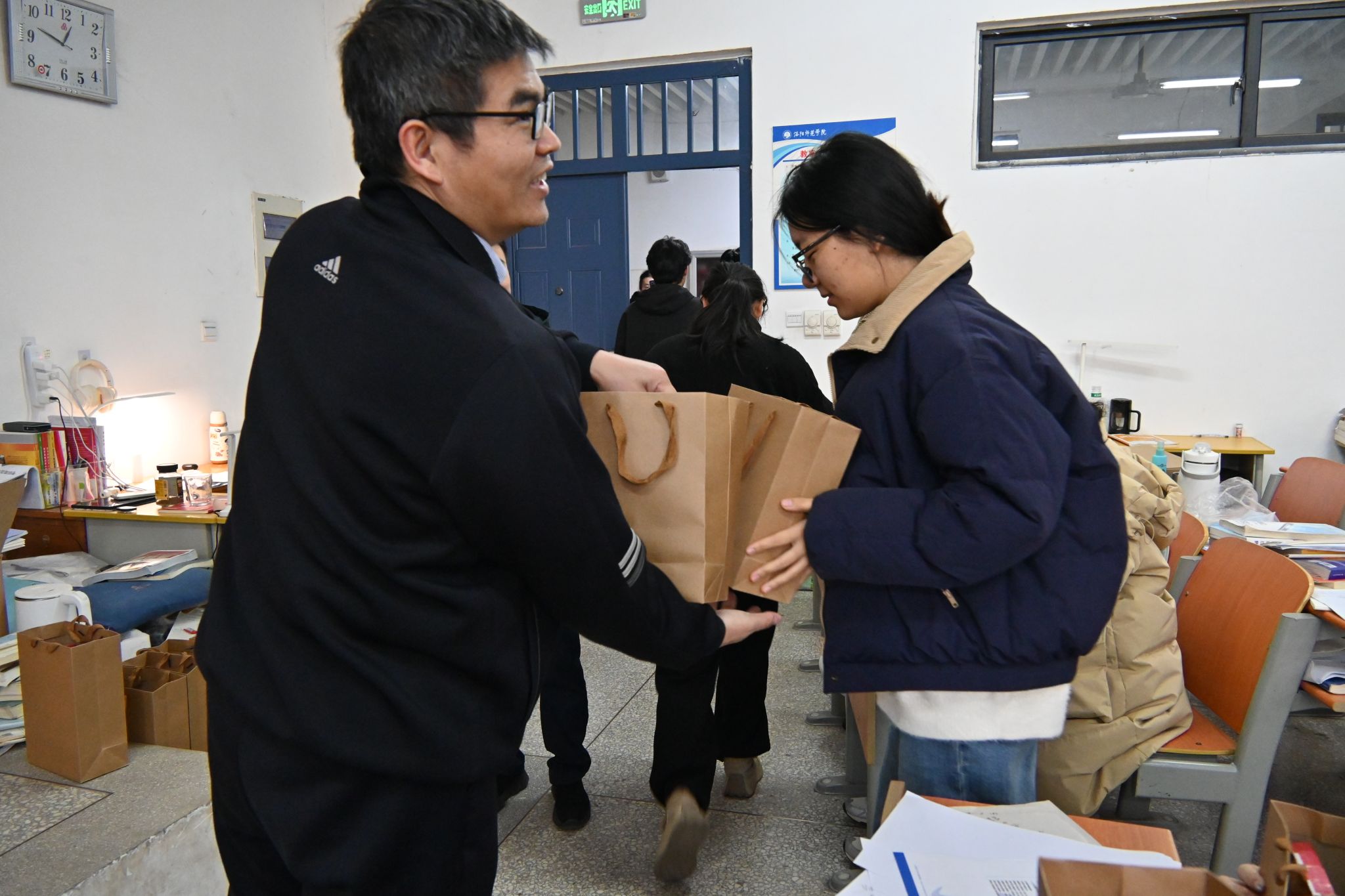 此外,学院还为学生准备了寓意深长的“备考五重加油礼”,苹果寓意“苹安落地”,橙子代表“心想事橙”,巧克力象征“巧克难题”,旺仔牛奶双盒祝愿“旺上加旺”,锅巴则取谐音“过吧”,当学院领导班子将满满关怀与祝福的实用礼物亲手分发给同学时,考研慰问活动现场充满了浓浓的师生情。