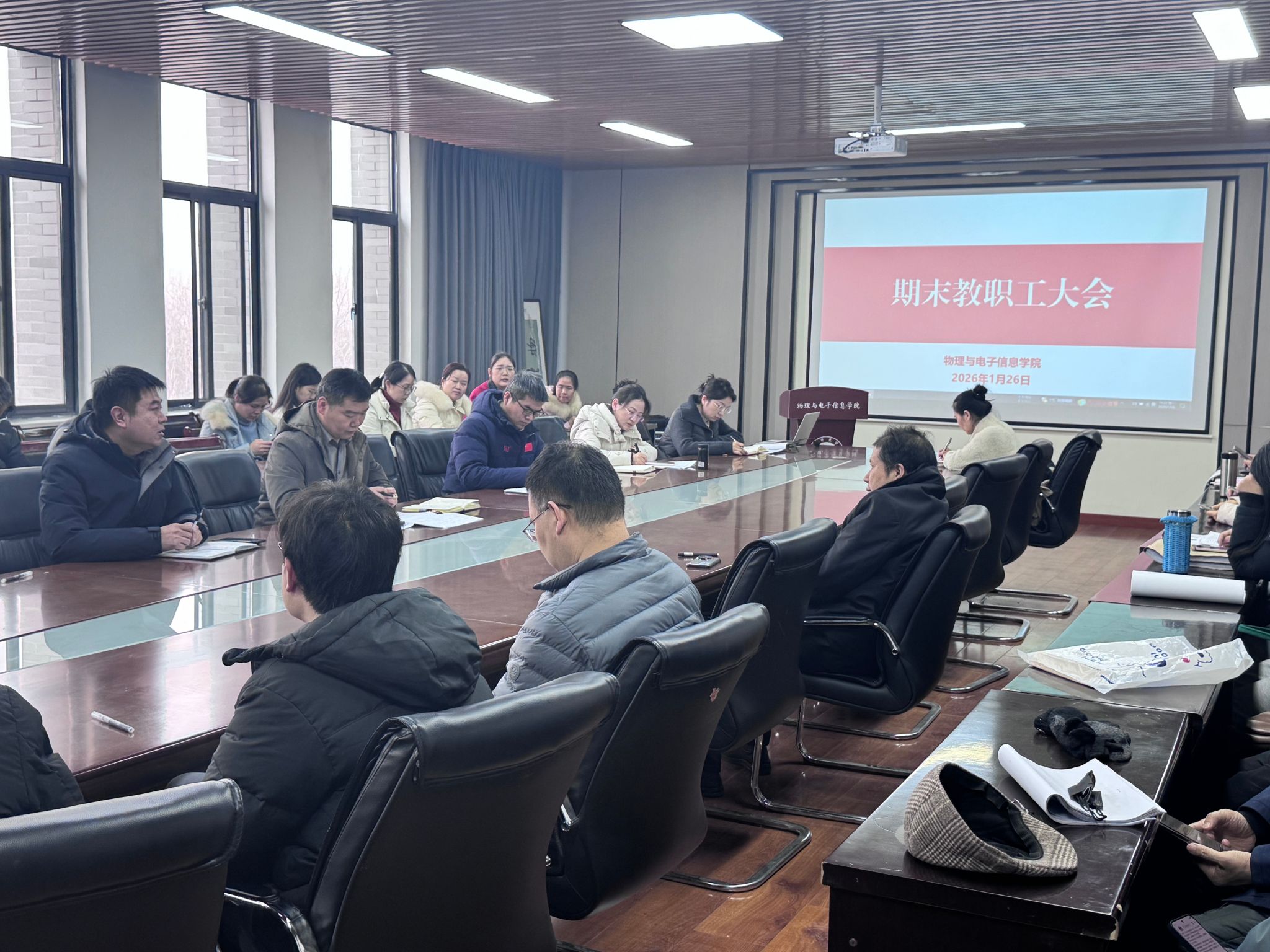 为全面总结本学期工作成效,科学谋划未来发展蓝图,1月26日,我院召开学期末全体教职工大会暨“双攻坚”工作部署会。学院党委书记李广、院长彭枫、党委副书记高小静、副院长刘强、高雅及全体教职工参会。