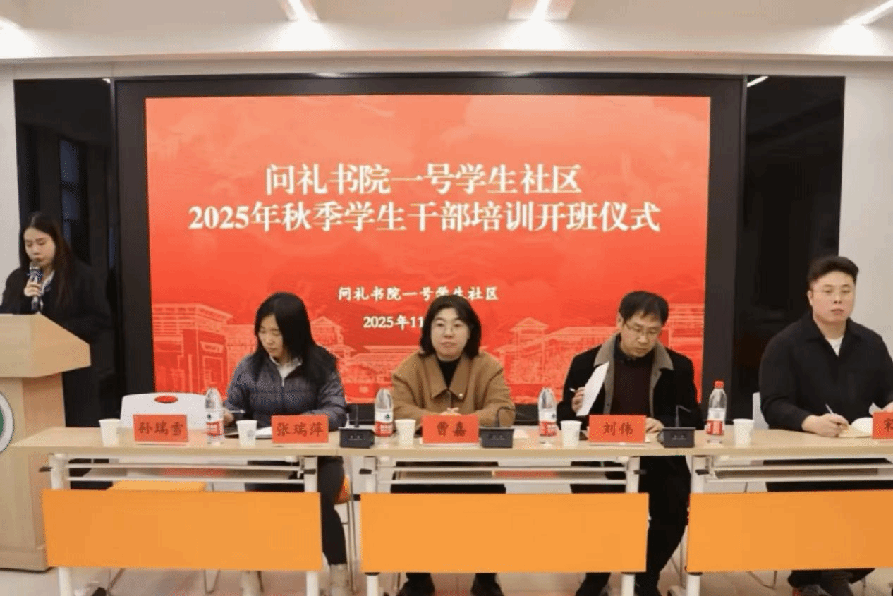 为进一步加强团学干部队伍建设,提高团学干部整体素质,2025年11月26日至12月19日,问礼书院一号学生社区在问礼大讲堂举办秋季团学干部培训班。社区党委书记曹嘉、院长刘伟,党委副书记张瑞萍、育人导师(辅导员)宋豪、孙瑞雪等出席培训班开班仪式。全体团学干部全程参加培训。