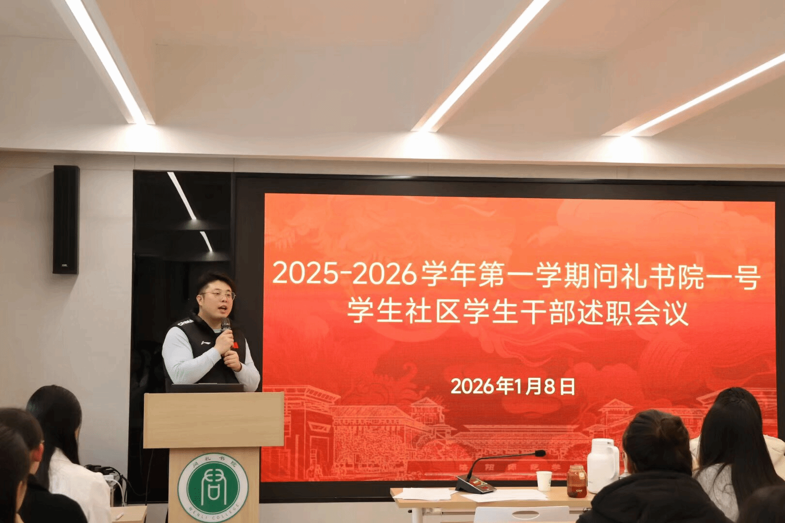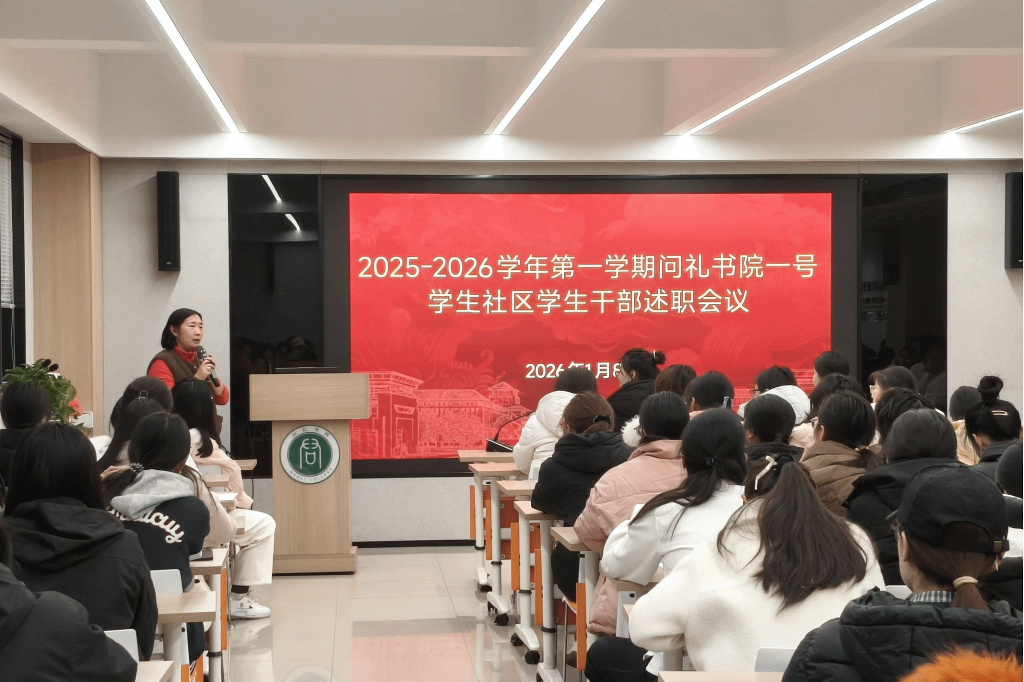 为全面总结本学期学生社区工作成效,客观评估学生干部履职情况,切实提升学生工作质量与团队凝聚力,2026年1月8日,问礼书院一号学生社区在问礼大讲堂召开2025-2026学年第一学期学生干部述职会议。