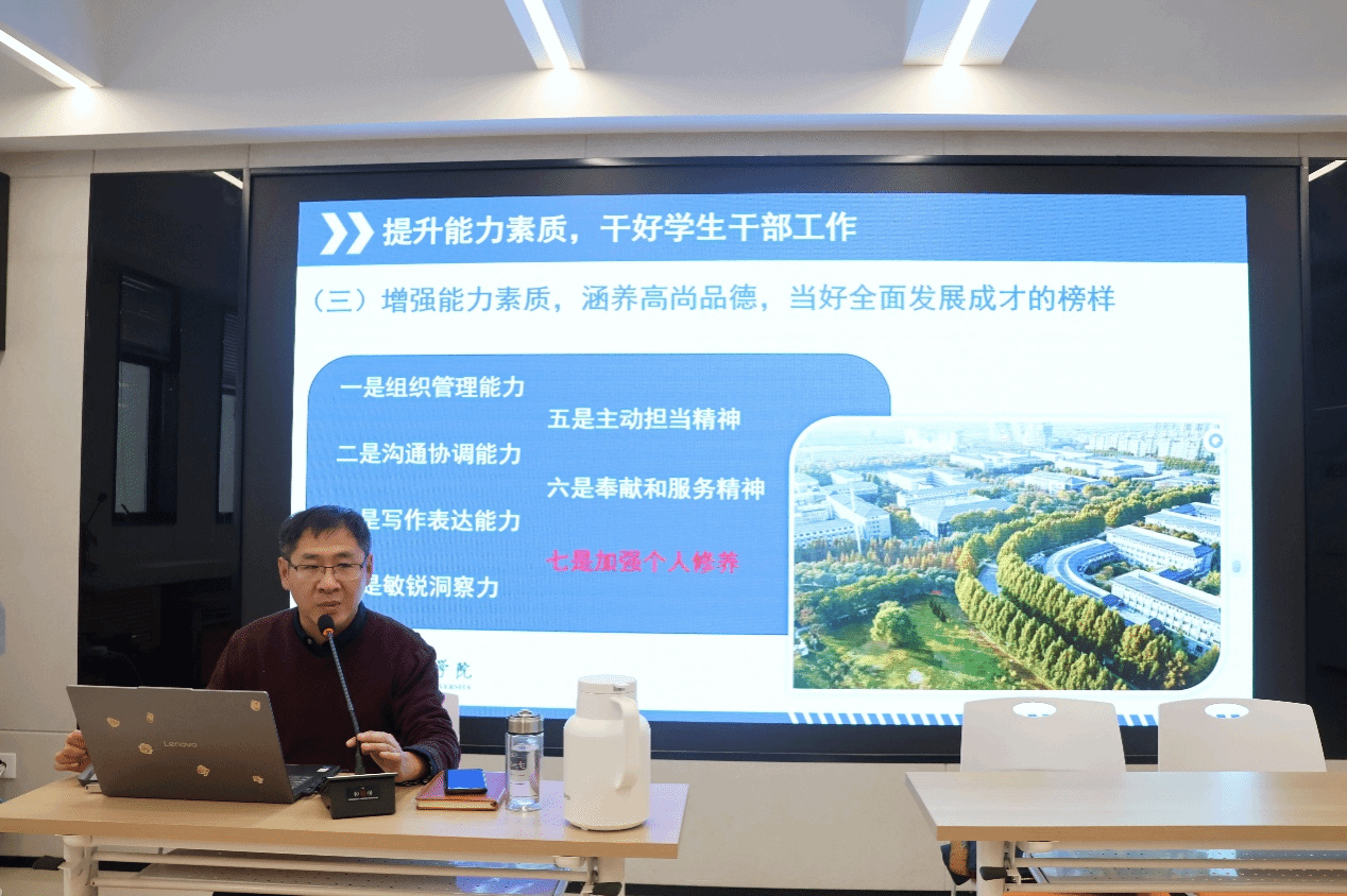 刘伟以“把准角色定位,提升能力素质”为题,围绕“认清学生干部的角色定位”“明确职责作用”“提升能力素质”三个方面展开培训。他指出,学生干部要主动承担起“沟通者”“管理者”“组织者”“引领者”“服务者”等多重角色。他强调学生干部首先是学生,学习是第一要务;其次是干部,要配合老师开展工作;第三是学生干部,要实现学生与干部的身份统一。在能力素质上,刘伟要求学生干部当好坚定理想信念,强化使命担当,当好立志报效国家的榜样;认真学习钻研,勇于实践锻炼,当好践行优良学风的榜样;增强能力素质,涵养高尚品德,当好全面发展成才的榜样;展示优良作风,密切联系师生,当好上传下达信息的榜样。
