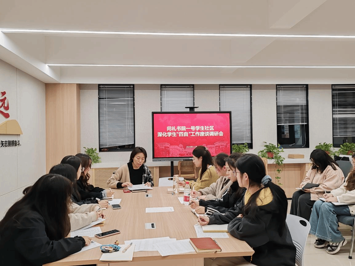 为进一步推进学生自我管理、自我服务、自我教育、自我监督,提高社区治理的学生参与度,11月2日,问礼书院一号学生社区在问礼小氧吧召开深化学生“四自”工作座谈调研会。会议由社区党委副书记谭音主持,全体学生干部参会。