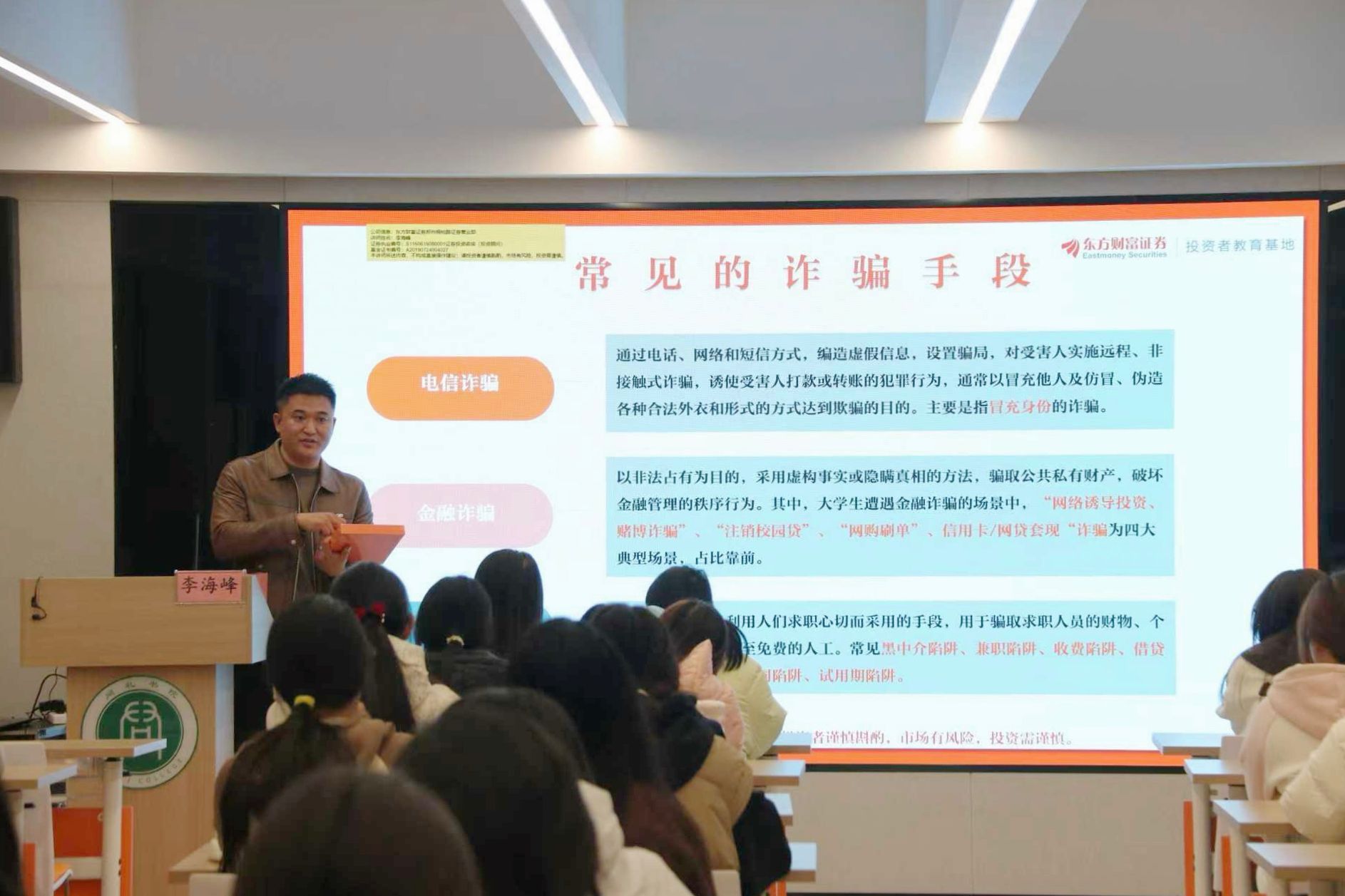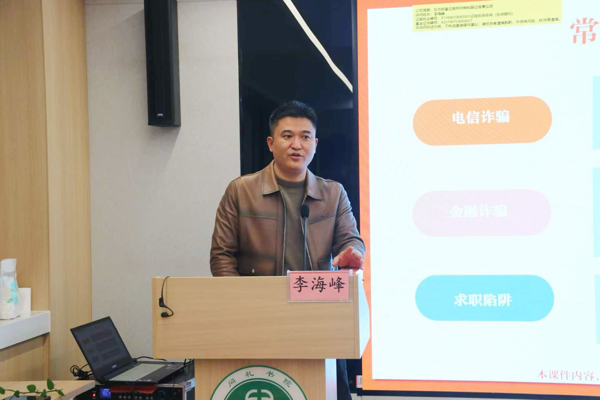 为进一步提高学生防电信网络诈骗意识,筑牢安全防线,11月18日,问礼书院一号学生社区主办、法学与社会学院和商学院承办,“危机智策”辅导员工作室协办的防电信网络诈骗专题讲座——《知晓常见诈骗手段,增强个人风险意识》,在问礼大讲堂举办。讲座特邀东方财富证券公司李海峰担任主讲。书院社区学生参加。