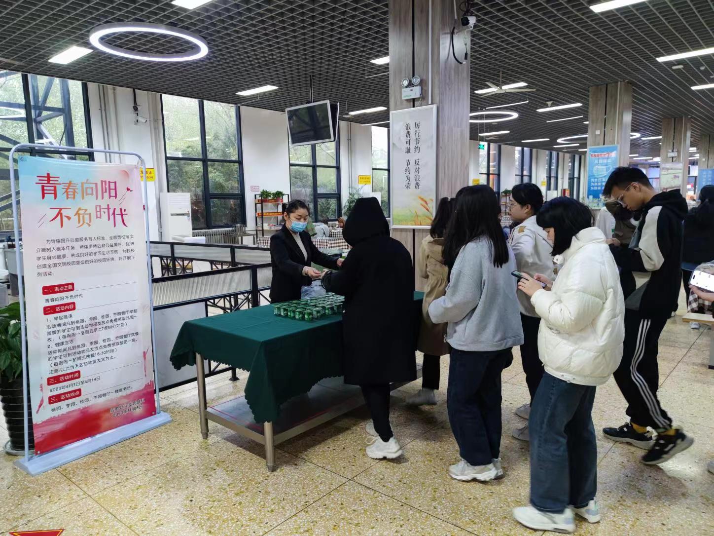 一年之计在于春,一日之计在于晨。4月3日至4月14日,后勤处伙食管理科充分发挥阵地育人作用,在学校四个餐厅开展为期10天的“青春向阳,不负时代”为主题的早起晨读送鸡蛋活动,加强学生养成教育,培养学生早起晨读、早起锻炼的好习惯。
