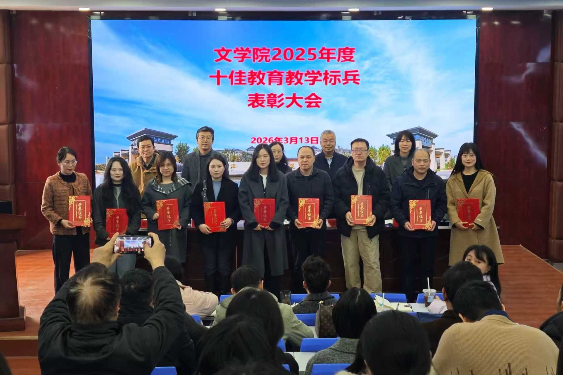3月13日,文学院在A8-102进行2025年度“十佳教学标兵”表彰。学院领导班子及全体教师参会。本次表彰旨在落实立德树人根本任务,发挥优秀教师示范引领作用,营造优良教风学风。会议现场宣读表彰决定,刘知萌、孙丽、侯佳利、肖娜、吴茜、郭俊华、秦铭伟、孙文周、郭海洋、乐晋霞十位教师荣获“十佳教学标兵”称号。本次受表彰教师均深耕教学一线,他们治学严谨、倾心教书育人,为全院教师树立了榜样。