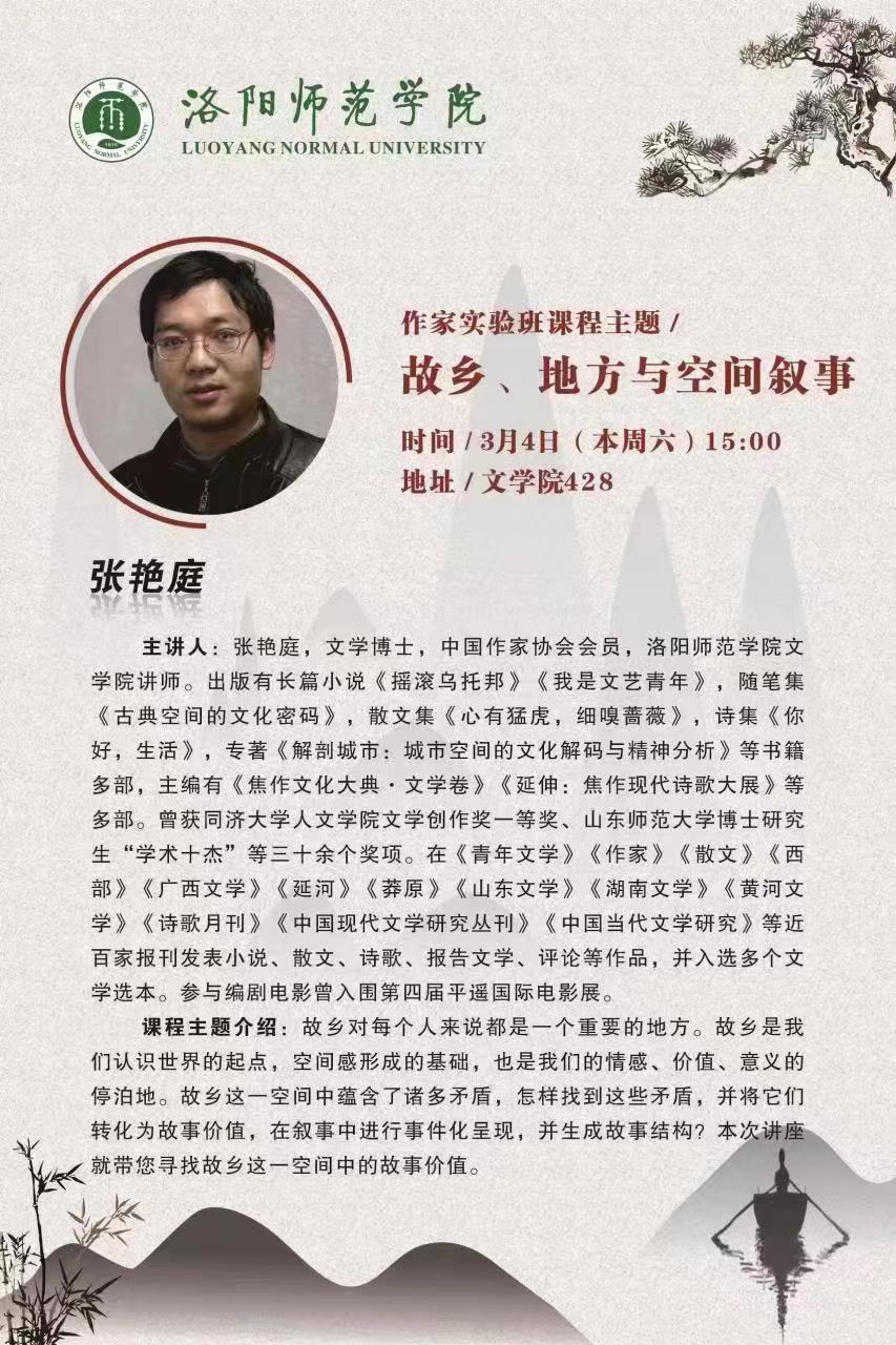 3月4日下午,文学院作家实验班首次主题讲座于A8-428会议室顺利开讲。本次讲座的主题为“故乡、地方与空间叙事”,由实验班班主任张艳庭博士主讲,实验班学员参加,文学院教师代表以及其他专业学生列席旁听。