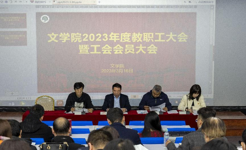 会议在庄严的国歌中拉开帷幕。院长王建国向全体教工作2022年工作报告,并部署学院2023年工作重点。接下来,张曼向全体教工做了《文学院分工会工作报告》。