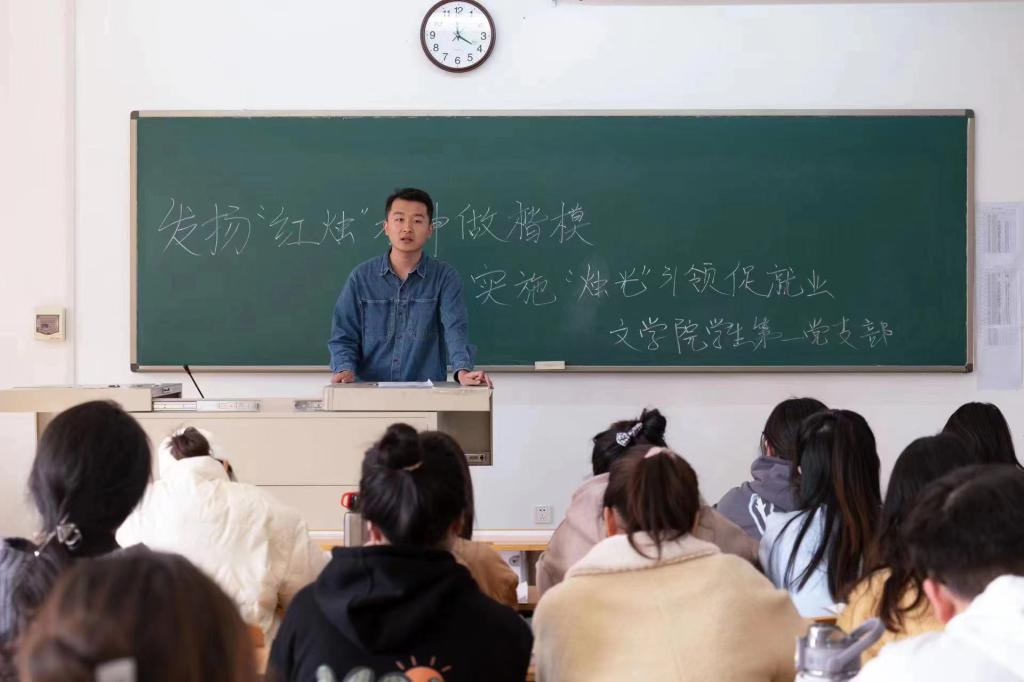 根据《洛阳师范学院“党建提质行动”实施方案》要求,文学院党委精心谋划,统一部署,师生党支部于4月6日分别于A8-428、A8-402等教室,组织支部党员开展“发扬‘红烛’精神做楷模,实施‘烛光’引领促就业”主题党日活动。