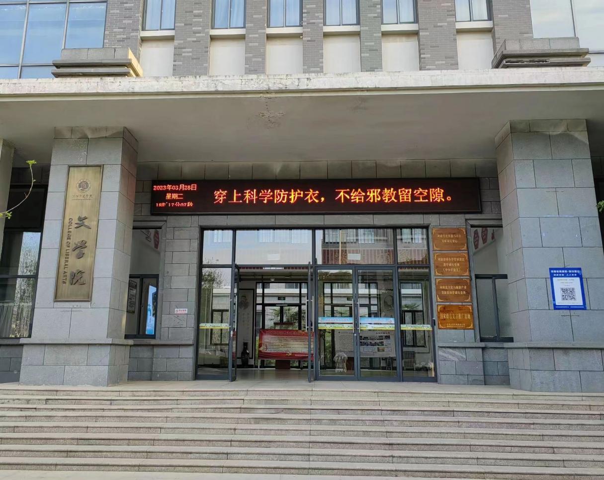 学院积极利用电子屏、电视屏、微信公众号等载体,以师生喜闻乐见的形式进行宣传,营造良好的安全教育氛围,让学生深刻认识到“反邪教”对个人乃至国家的重大意义,从而促使学生加强自身行为规范,筑牢安全防线。