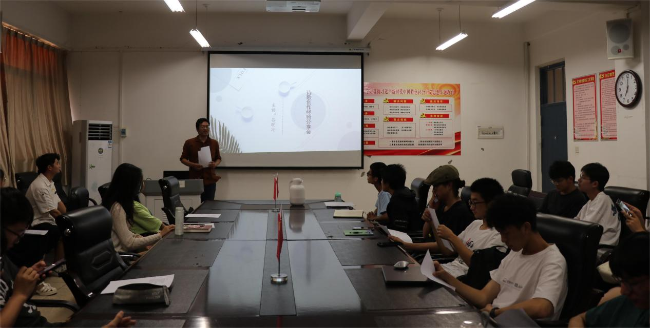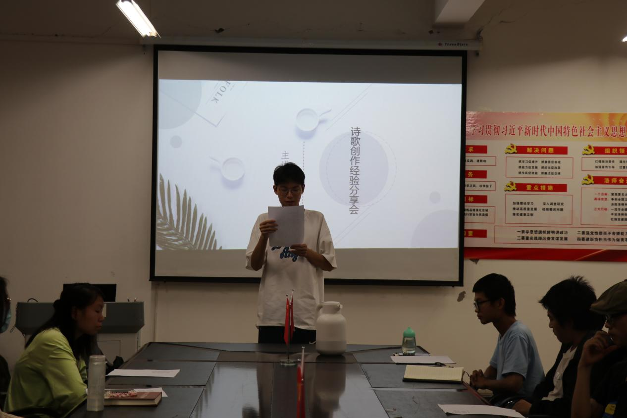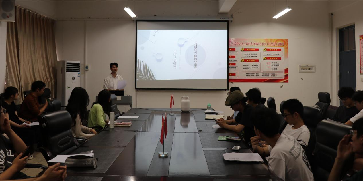 6月8日晚,洛阳师范学院文学院2023届毕业生、作家实验班成员谷明冲以《校园现代诗歌创作经验及意义漫谈》为题,于文学院A8-428开展创作经验分享。本次分享会由文学院教师张艳庭博士主持,作家实验班学员与我校部分诗歌爱好者参加。