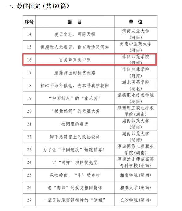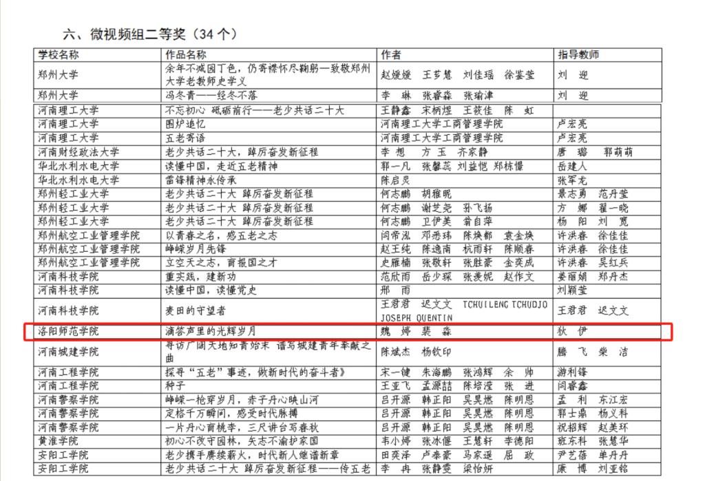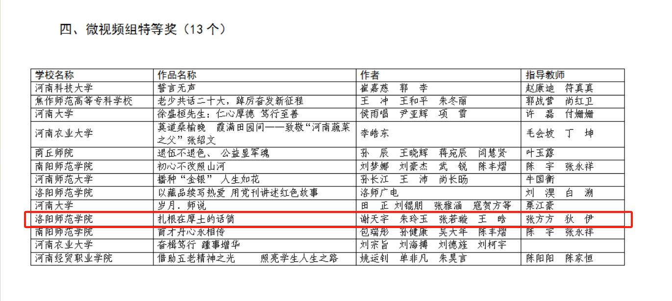 近日,2023年全省高校“读懂中国”活动落下帷幕。经组织专家评审、省教育厅关工委审定,我院池艺颖同学的征文作品《百灵声声响中国》脱颖而出,荣获征文组特等奖;谢天宇、朱玲玉、张若璇、王晗制作的微视频《扎根厚土的话筒》荣获微视频组特等奖;魏婷、裴森同学的作品《滴答声里的光辉岁月》荣获微视频组二等奖。其中征文组特等奖作品《百灵声声响中国》被教育部关工委遴选为优秀展示作品,制作成视频,近期将在中国教育电视台展播。