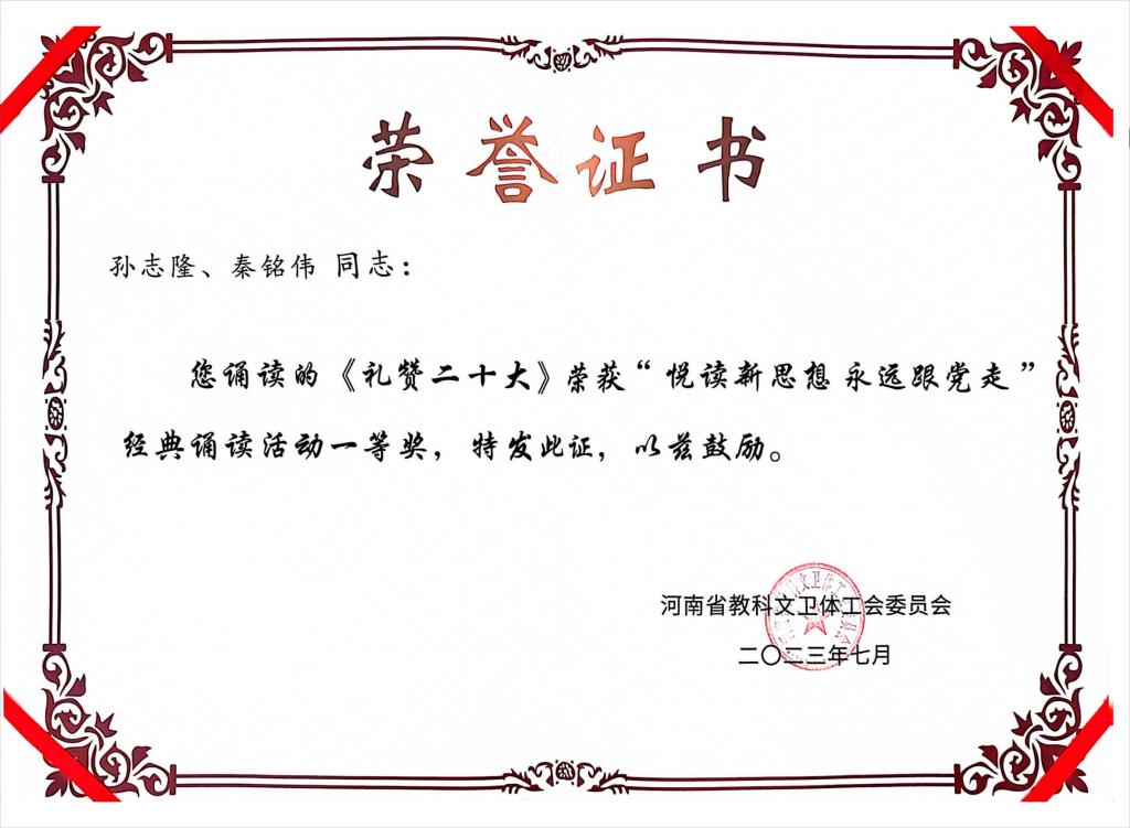 近日,河南省职工经典诵读活动“悦读新思想 永远跟党走”圆满落下帷幕。经组织专家评审、省教育厅关工委审定,学院秦铭伟和校团委孙志隆的作品《礼赞二十大》荣获长视频三等奖、省教科文卫体系统一等奖。