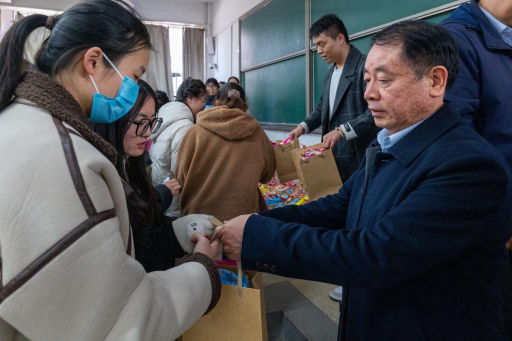院长王建国对考研学子们刻苦勤奋、力学笃行的精神给予高度肯定。他鼓励学生要劳逸结合、坚持不懈、在考试中力争上游并预祝同学们顺利考入理想院校。党委书记张方方叮嘱大家注意天气变化、注意各类安全,勉励同学们拥有一个好心态,调整一个好状态,争取一个好成绩。随后,各位领导及老师将考研暖心大礼包送至每一位考研学子手中,这寄托着文学院对考研学子的美好祝愿,同时也为学子们送上心灵上的慰藉。