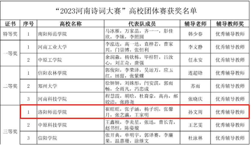 近日,河南省教育厅公布了2023年度河南省诗词大赛评审结果,我院孙文周老师获优秀指导教师称号,并指导学生荣获个人赛一等奖2项,团体赛三等奖1项。