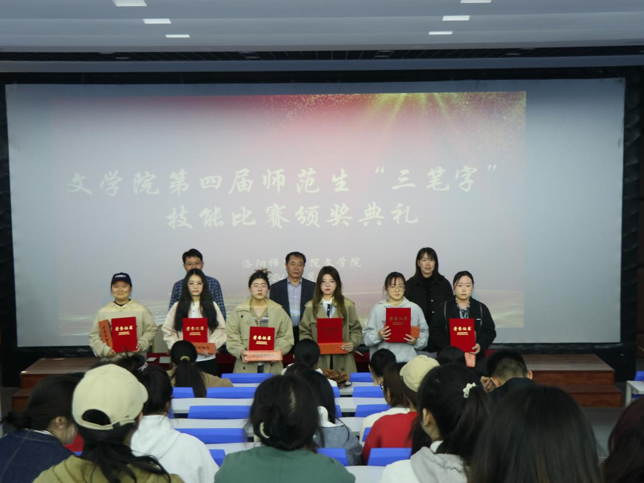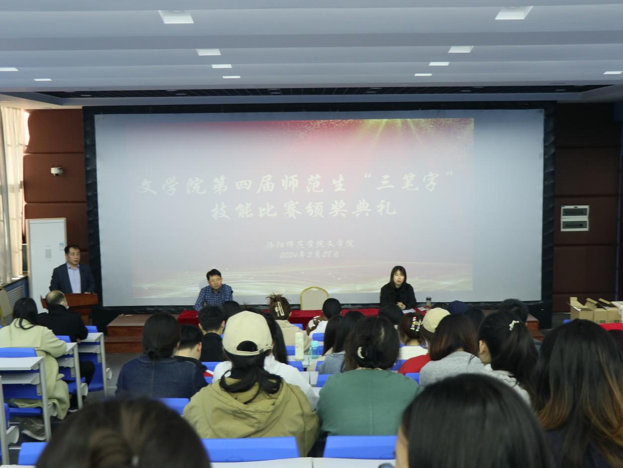 2024年3月28日下午,文学院在A8-102举行第四届师范生“三笔字”技能比赛颁奖仪式。文学院院长王建国,副院长于涌、李亚,党委副书记张曼出席仪式,书法教师孙文周以及全体获奖学生参加本次仪式。颁奖仪式由于涌主持。