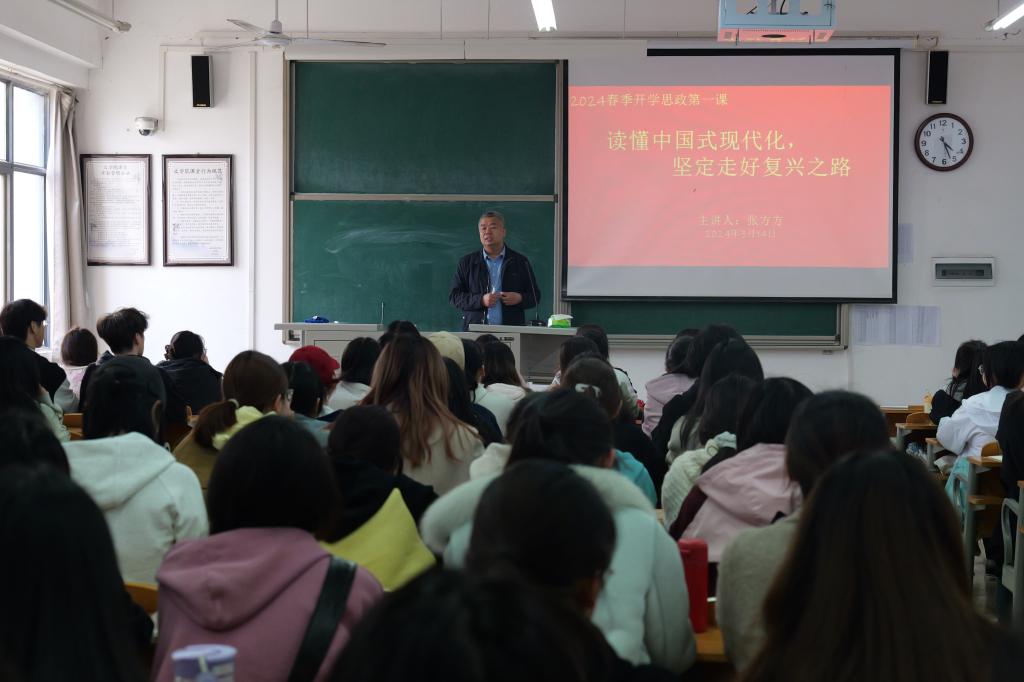 3月14日下午,文学院于A8-210教室开展以“读懂中国式现代化,坚定走好复兴之路”为主题的春季开学思政第一课,文学院党委书记张方方主讲,23级学生参加。
