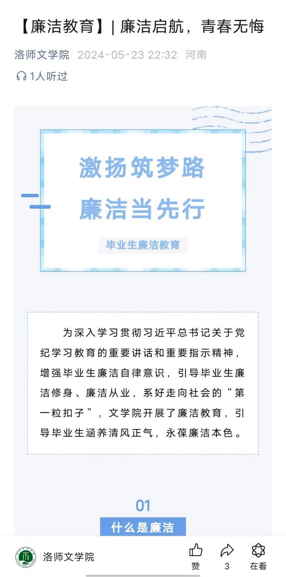 “人之美,在于公正清廉。”文学院聚焦立德树人根本任务,以理想信念强基固本、以先进文化启智润心、以高尚道德砥砺品格,引领广大毕业生走上工作岗位后,继续秉持“敬业奉献 为人师表”的校训,让清风与信念同行,让廉洁与青春相伴,勿忘理想信念,承载强国梦想,担负起新时代的青春责任。