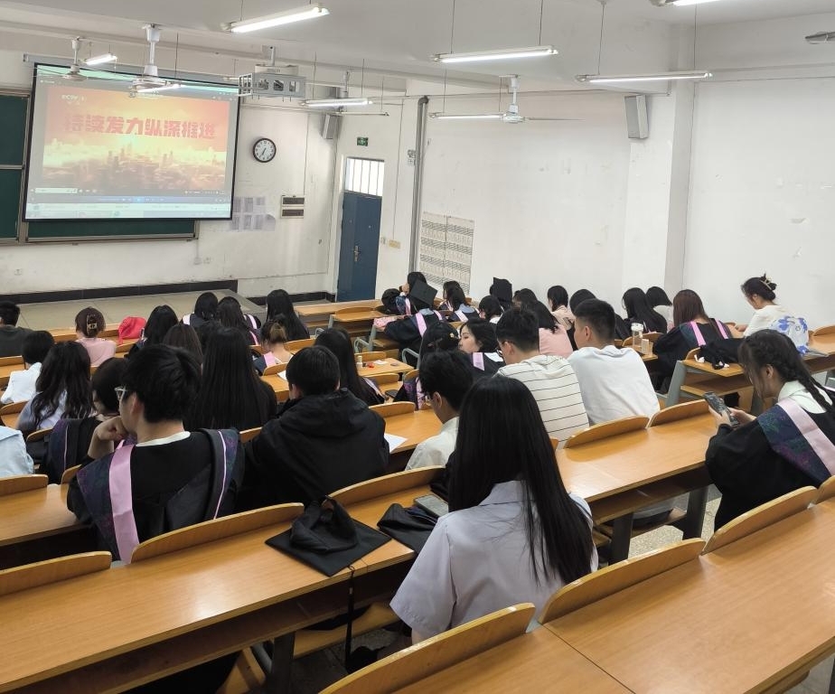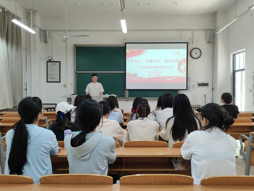文学院辅导员郝帅昌在2024届毕业生即将离校之际,召开以“不忘初心,永葆本色,廉洁起航”为主题的毕业生党员廉洁教育大会。郝帅昌勉励即将走向社会的同学们堂堂正正做人,干干净净做事;牢记党和国家的嘱托,以实现中华民族伟大复兴为己任,增强做中国人的志气、骨气、底气,不负时代,不负韶华,用青春美好时光实现自我人生价值。