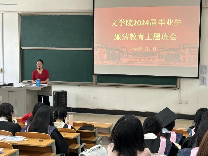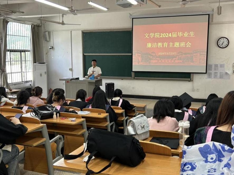 5月23日,文学院在A8-101召开2024届毕业生廉洁教育主题班会,辅导员陈晓于、郝帅昌主讲。班会旨在引导毕业生养成“以廉为荣,以贪为耻”的人生观,教育全体毕业生把清正廉洁时刻根植于心,践之于行,做严于律己的新青年。希望全体毕业生在思想上树立正确的世界观、人生观、价值观;在工作上加强学习、恪尽职守;在生活上勤俭节约、艰苦朴素。