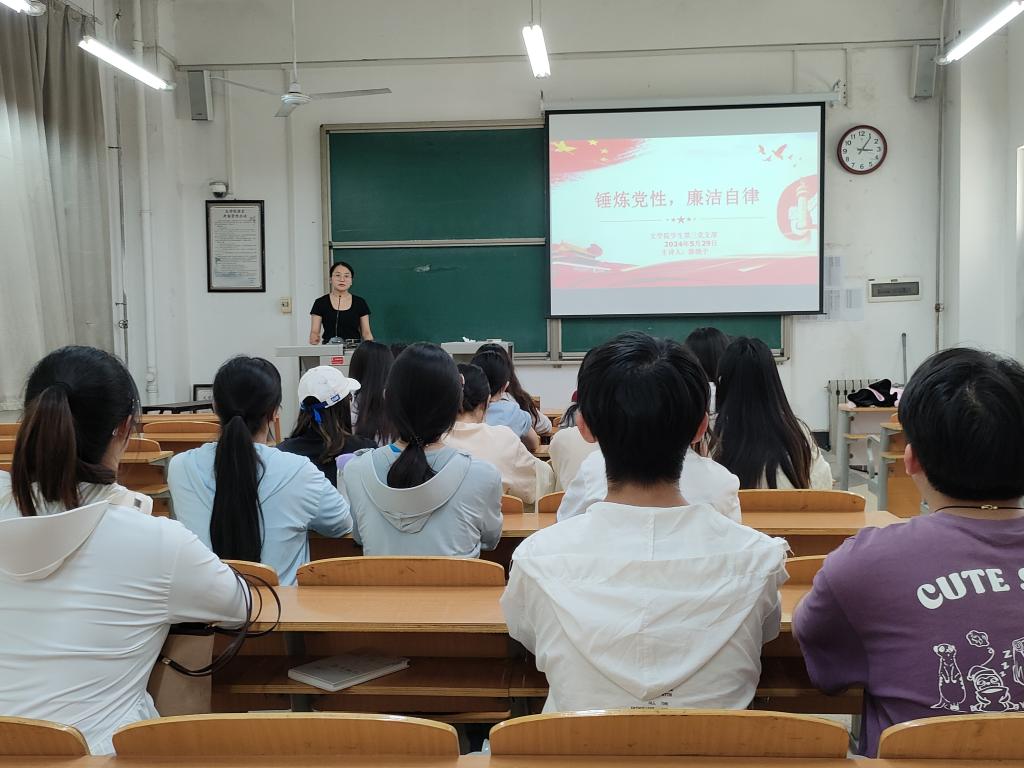 文学院2024届学生第三党支部组织全体党员开展“锤炼党性,廉洁自律”主题党日活动。支部书记陈晓于通过领学《中国共产党廉洁自律准则》、廉政警言、反腐警示录等内容,利用所学、所思、所悟,积极分享正能量,树立毕业生党员正确的道德观,遵守社会公德,严格约束个人私德,时刻把党规党纪印在心上。