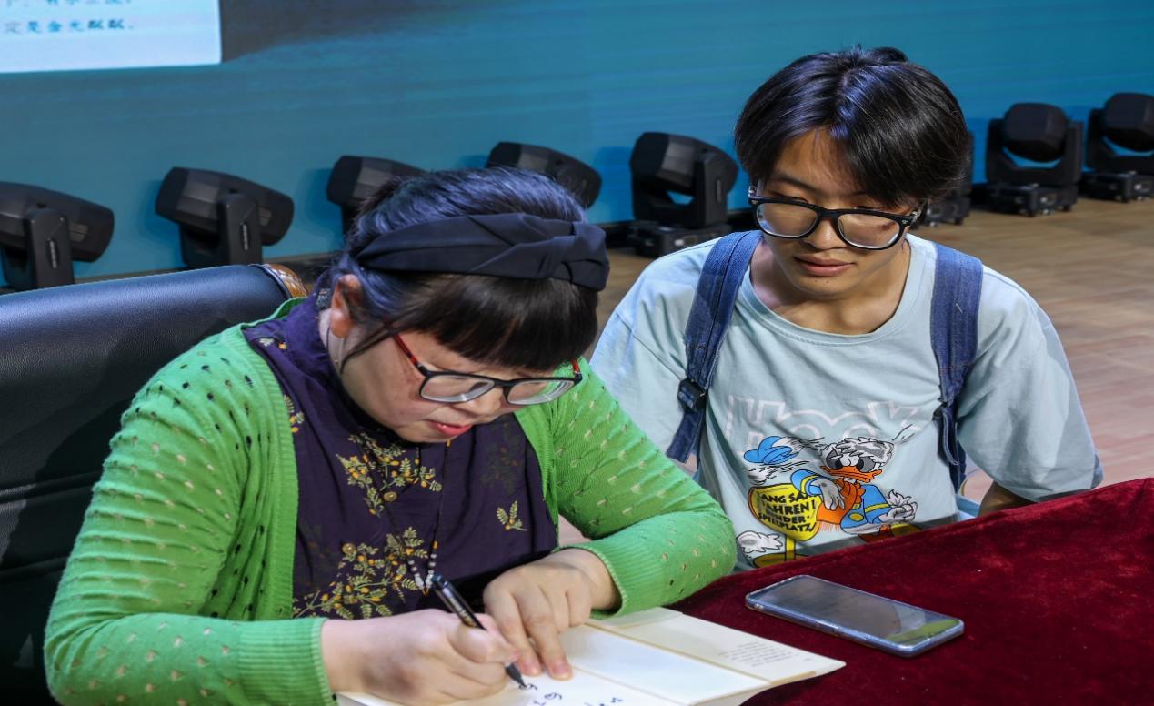 分享会后,乔叶老师与现场听众积极互动交流,对我院作家实验班学员、新季风文学社社长屈子涵关于新生代文学创作者发展问题进行了详细的回答。她鼓励新生代文学创作者多阅读自己喜欢的作者,写自己想写的作品,不要着急,今后会有阅历和经验的,并寄语洛阳师范学院新季风文学社:“向下扎根,向上生长”。