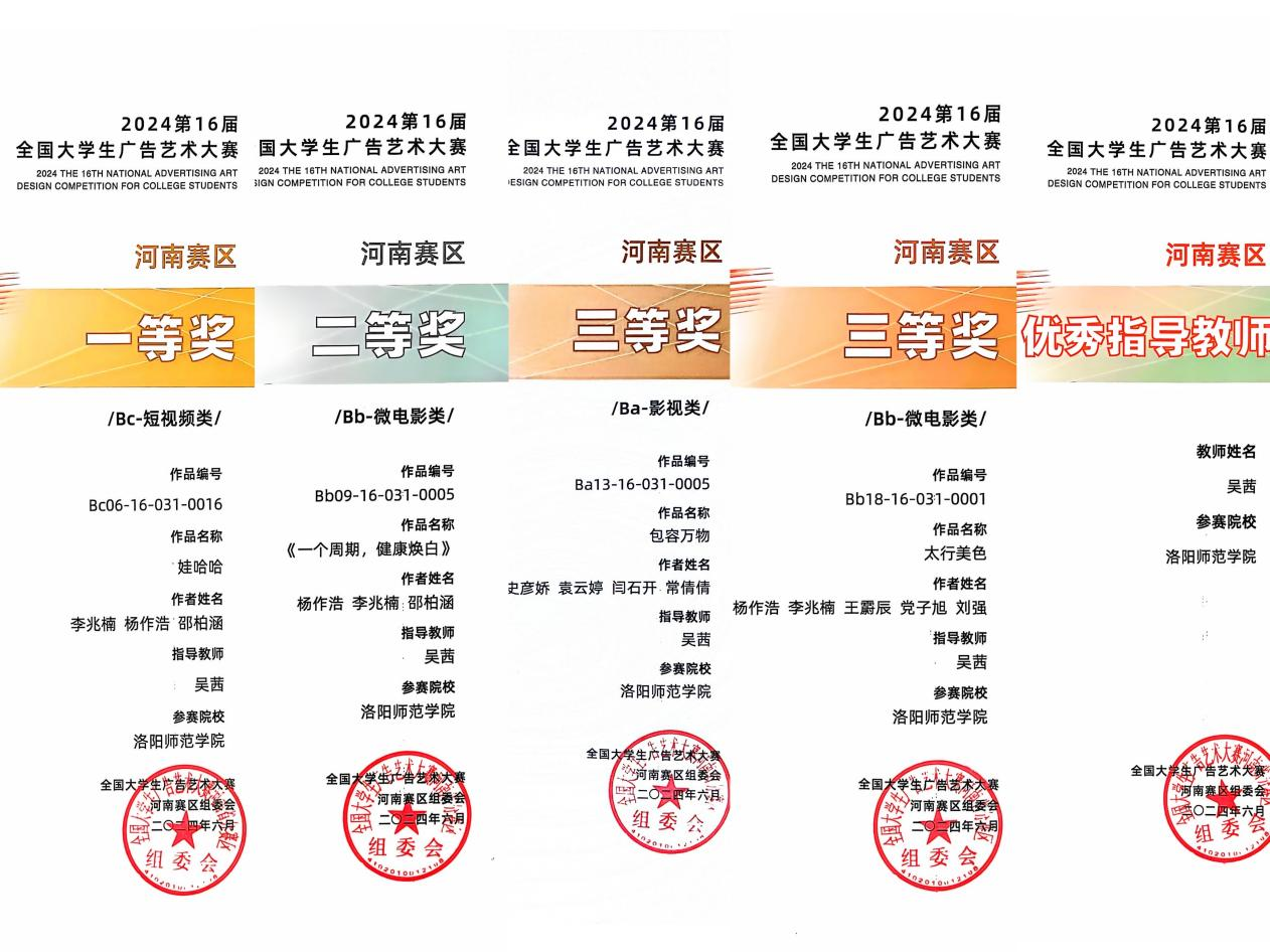 在第16届全国大学生广告艺术大赛中,我院师生首次参赛,凭借出色的作品,脱颖而出,斩获佳绩。本届大赛覆盖全国29个赛区的1873所高校,参赛作品超75万件,参赛师生高达190万人次。文学院学生在此次比赛中大放异彩,李兆楠、杨作浩、闫石开、常倩倩、袁云婷、史彦娇、党子旭、王霨辰、刘强等同学的作品《哇哈哈》、《一个周期,健康焕白》、《包容万物》、《太行美色》荣获河南赛区省级短视频一等奖1项、微电影二等奖1项、影视三等奖1项以及微电影三等奖1项,我院吴茜老师被授予河南赛区优秀指导教师称号。