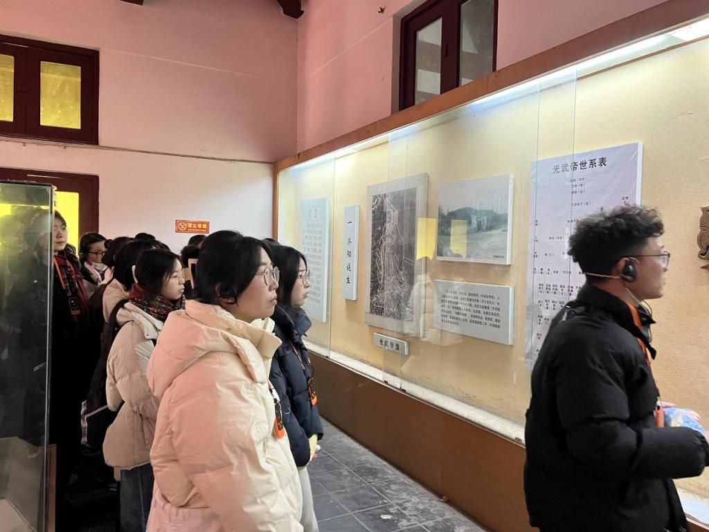 上午第二站是汉光武帝陵。该陵始建于公元50年,由神道、陵园和祠院组成。研学学生阅读陵园石碑记载的刘秀功绩,观赏历史悠久的柏树林,并了解到光武帝的起兵过程、建立东汉、统一全国、中兴汉室等事迹,被光武帝“有志者事竟成”“既平陇,复望蜀”的进取精神和勤政爱民的仁君风范所感染。