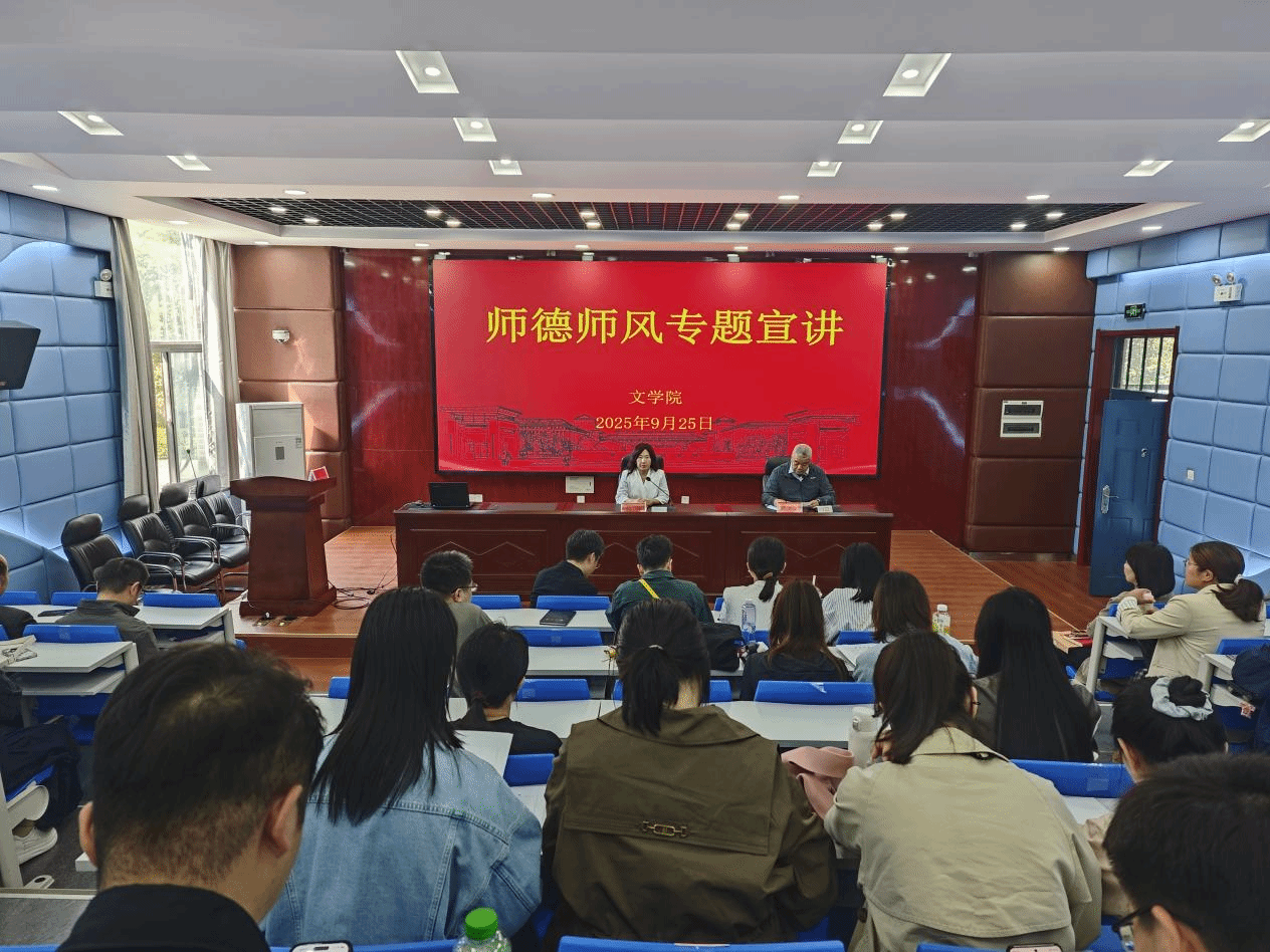 9月25日,文学院于A8-102开展“平凡粉笔写春秋,三尺讲台谱华章”师德师风专题宣讲会。马克思主义学院副教授张体主讲,文学院党委书记张方方主持,全体教职工参加。
