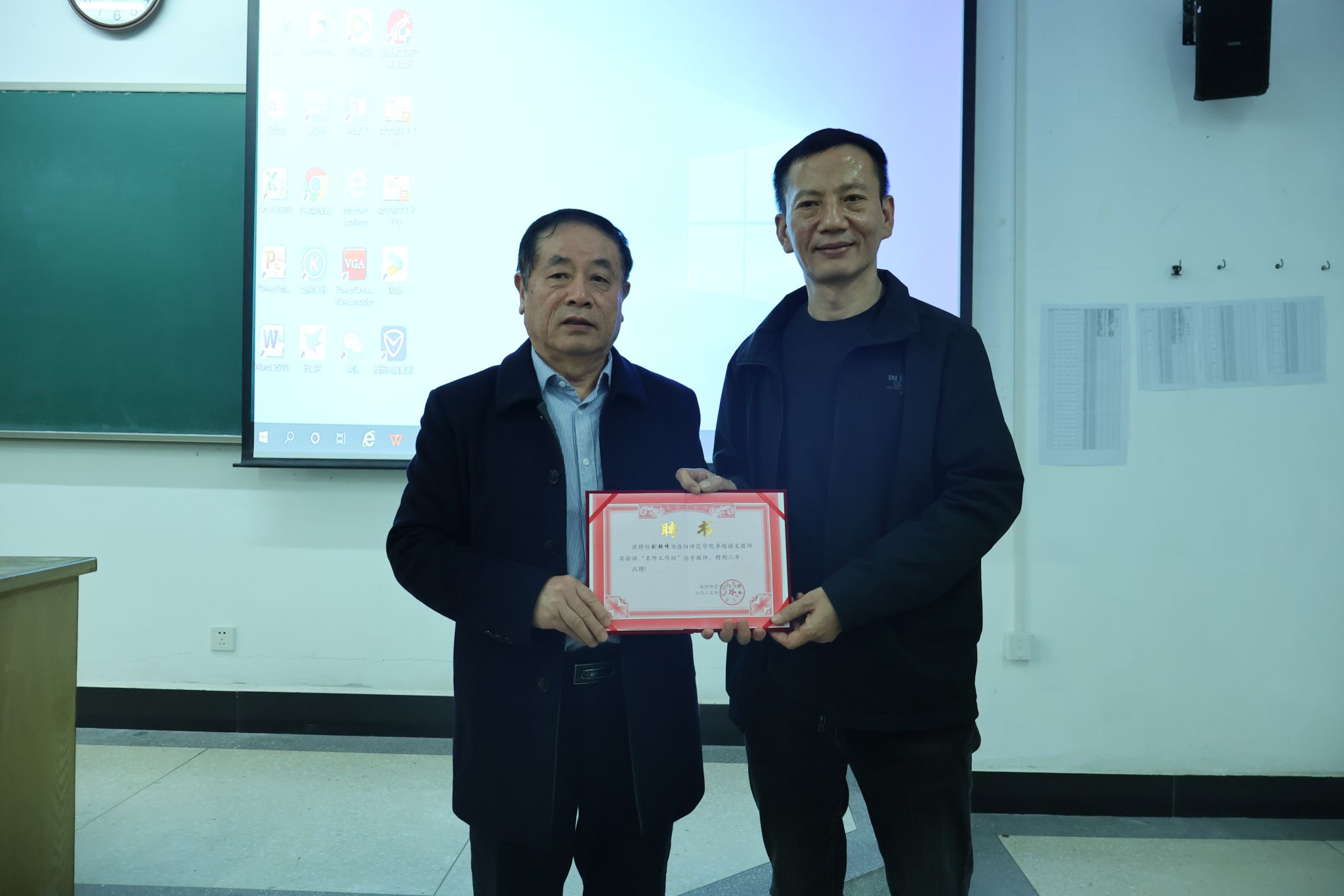 讲座伊始,王建国教授向同学们简要介绍主讲人刘朝峰老师的教学经历,并向刘朝峰老师致以热烈欢迎。接着,刘朝峰向在座学生简要介绍了洛阳魏书生中学的基本状况、教学理念、教学规范和教学追求。他指出,语文教学需要重视“新课程”“新课标”“新教材”三者在教学工作的推动作用,强调课堂教学要树立起以学生为中心的意识。随后,刘朝峰结合自身担任校长期间的实践经验,以课后题为具体案例,向同学们直观展示了完整的教学实施过程,叮嘱同学们要以“学为中心”,并注重“教、学、评”三位一体。最后,王建国教授为刘朝峰老师颁发“洛阳师范卓越语文教师实验班‘名师工作坊’指导教师”聘书,为本次活动画上了圆满句号。
