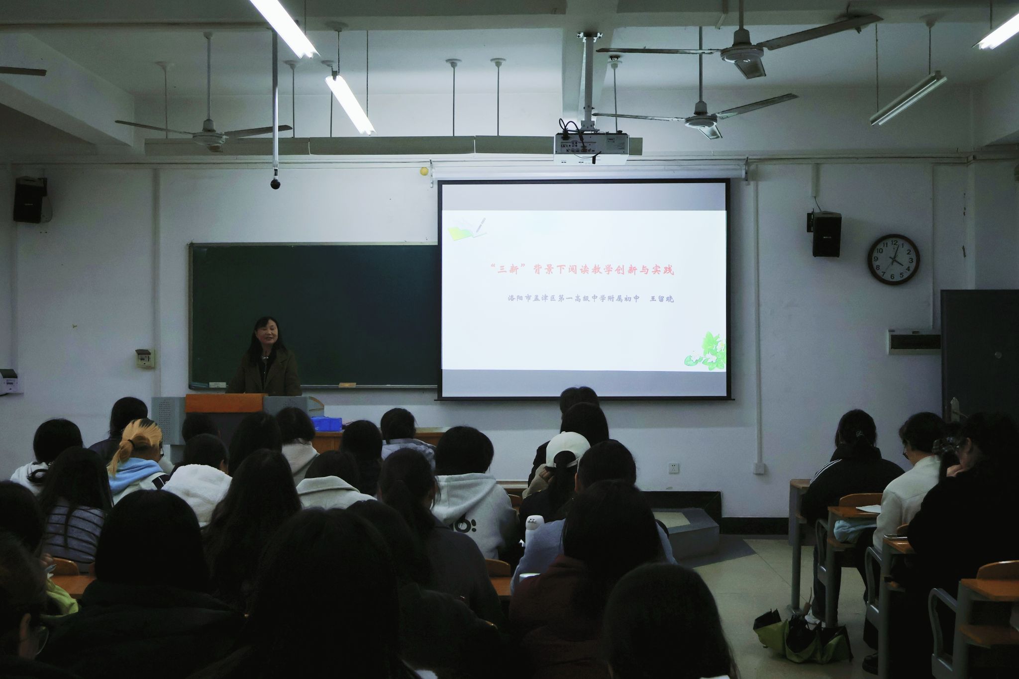 11月7日下午,文学院于A8-303教室举办“名师进课堂”系列讲座活动(第五期),讲座主题为“三新背景下语文课堂教学策略与优化设计”。本次讲座由河南省教育教学专家、河南省名师、河洛教育教学领军人才、中小学正高级三级教师王留晓主讲,文学院副院长于涌主持,文学院学生到场聆听。
