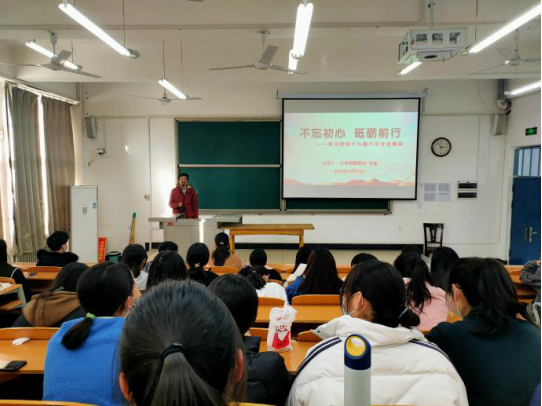 为了深入学习领会党的十九届六中全会精神,激发同学们立足新时代,抓住新机遇,争做时代弄潮儿的使命感和荣誉感。11月25日,文学院开展了“不忘初心,砥砺前行”的主题教育活动。本次活动由文学院副院长于涌主讲,全体学生干部参加。