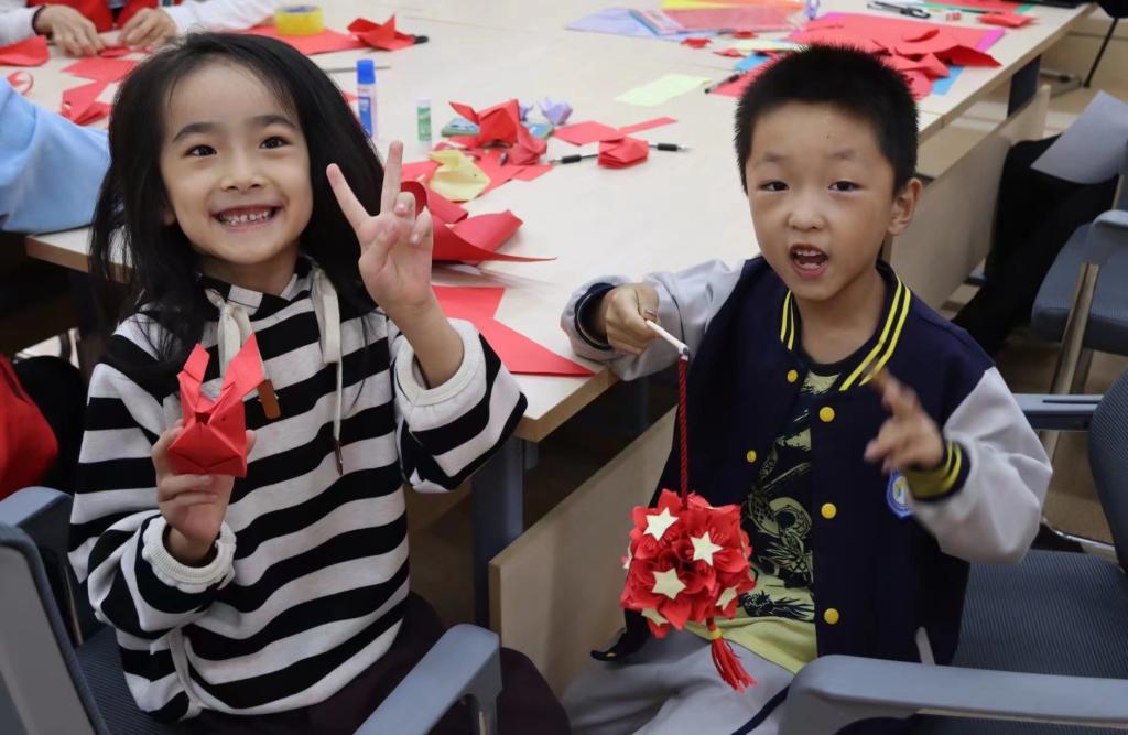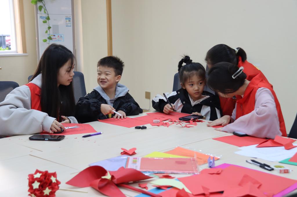 志愿者带领社区小朋友们剪纸