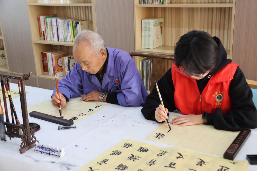 志愿者和社区书法爱好者一同书写古诗词