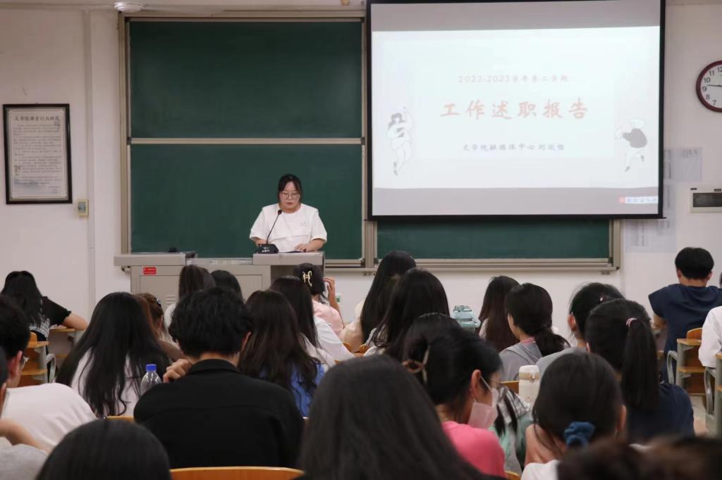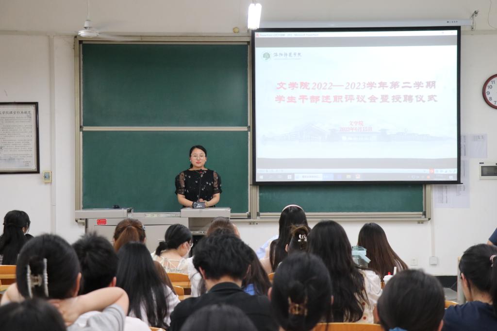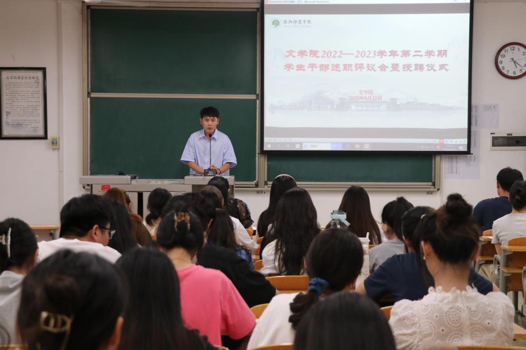 6月15日下午,文学院于A8-112召开2022-2023学年第二学期学生干部述职评议会暨授聘仪式,会议由文学院团委副书记赵子晗主持,辅导员陈晓于、朱柏帆、李楠,学院主要团学干部和2022级班长、团支书参会。