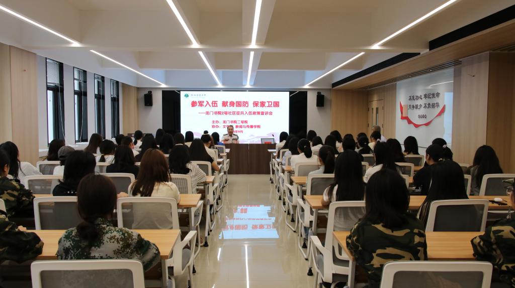 淬炼青春志,踔厉未来梦。为加强青年学子爱国主义教育、强化国防安全观念,9月19日,龙门书院2号学生社区在书院二楼崇学讲堂举办国防安全教育暨征兵入伍政策宣讲会。解放军某部刘政委受邀作宣讲报告,书院2024级新生到场聆听。