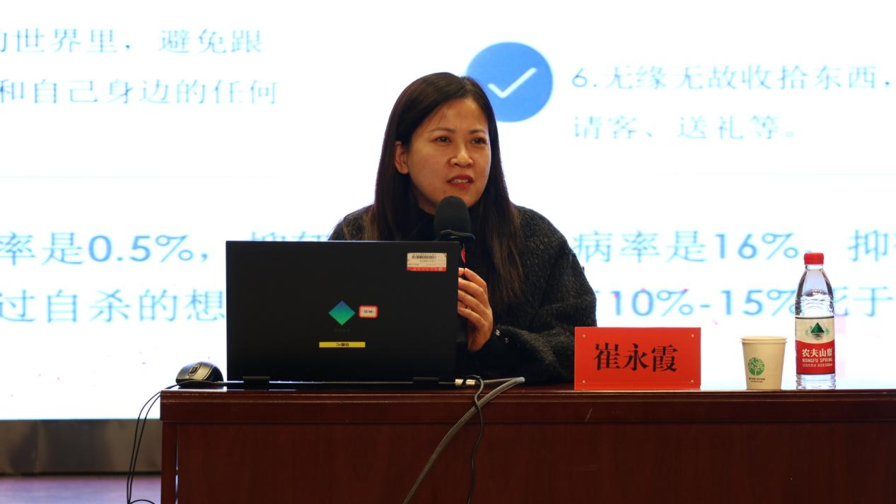 崔永霞以《大学生常见心理问题的识别与应对》为题,围绕大学生心理问题的影响因素、大学生常见心理问题及识别要点、应对策略与辅导技巧以及自我心理健康维护方法四个方面展开讲授。她指出,大学阶段是个人成长的关键时期,也是心理问题的高发阶段,大学生应学会正确认识和接纳自我,提高情绪管理能力,并鼓励大家遇到心理困惑时主动寻求专业帮助。此外,她还分享了多种心理调节方法和身体放松法,如积极心理暗示、腹式呼吸法及手指操等。