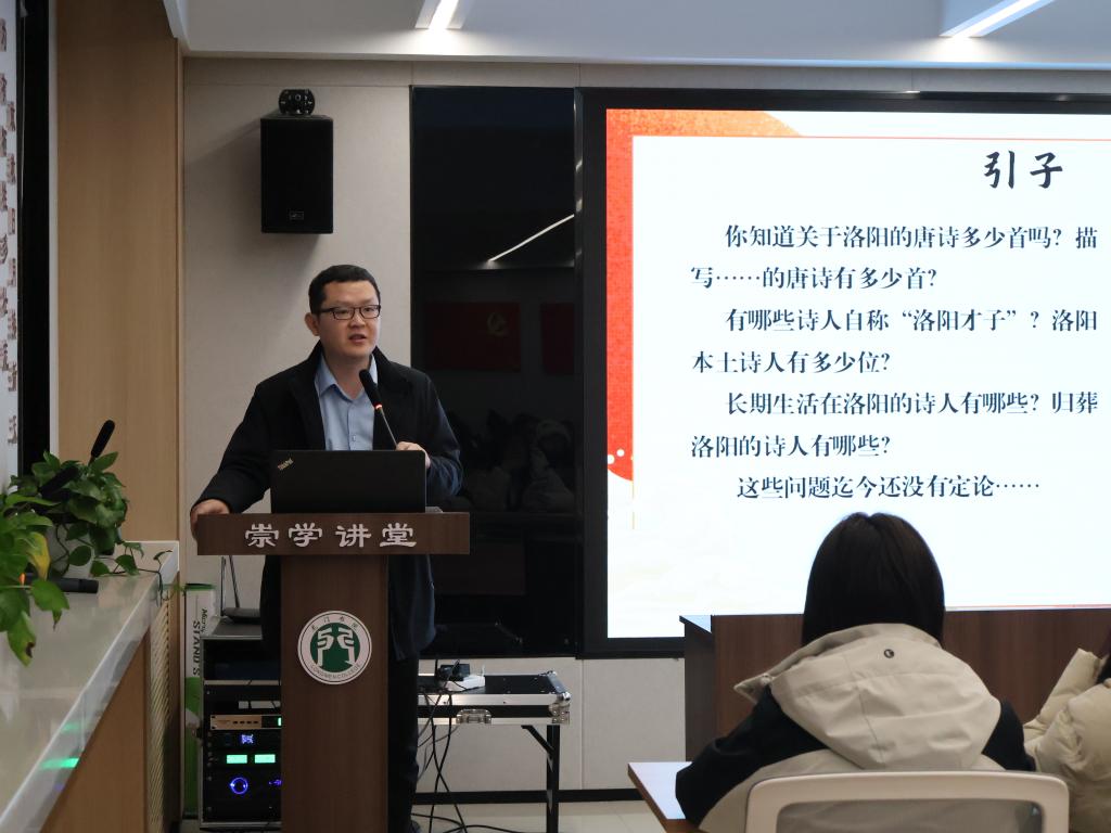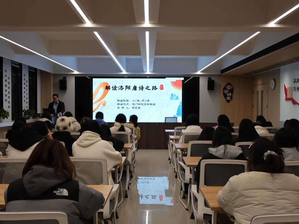 为深入挖掘“唐诗之路”,激活千年文化脉络,2月26日晚,龙门书院2号院在崇学讲堂开展洛阳唐诗之路研学课程设计专题分享会。本次分享会由文学院学业导师郭发喜主讲,书院社区学生代表参加。